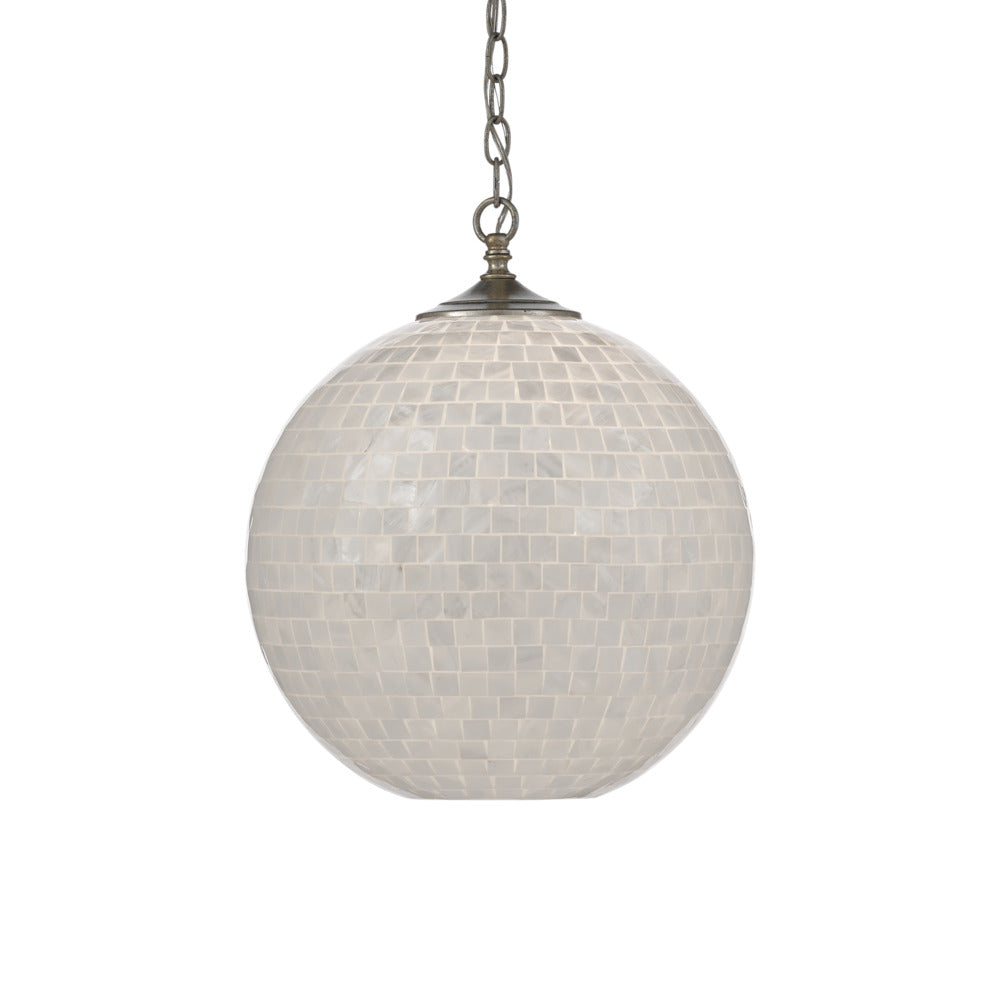 The Finhorn Pendant has an orb shape covered with small squares of mother of pearl. The metal affixing the globe pendant to the canopy, in an antique silver leaf finish, keeps this white pendant light. We also offer the Finhorn in a table lamp.