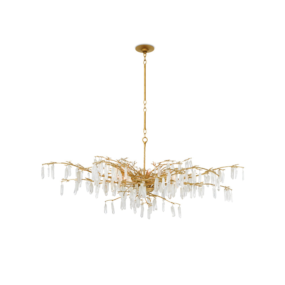 The Forest Dawn Chandelier is a truly exceptional work of art dripping with natural crystals. The beautiful washed Lucerne gold finish is a perfect complement to the quartz, the combination of which lends this gold chandelier a formal look. This crystal chandelier is in the Aviva Stanoff Collection.