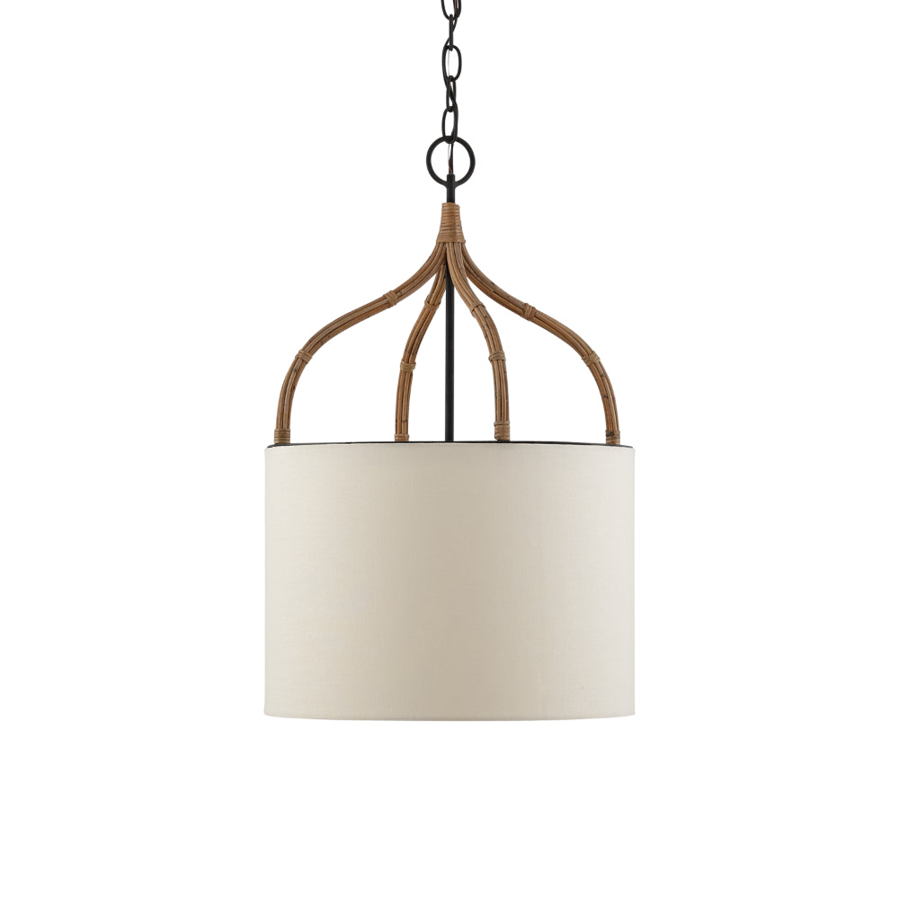Our Dunning Pendant has curving arms in wrought iron that are artfully wrapped in natural Arurog. The way the frame of this pendant clasps the off-white eggshell shade is a design note that brings the rattan chandelier its style.