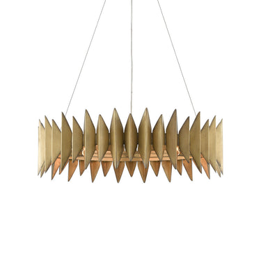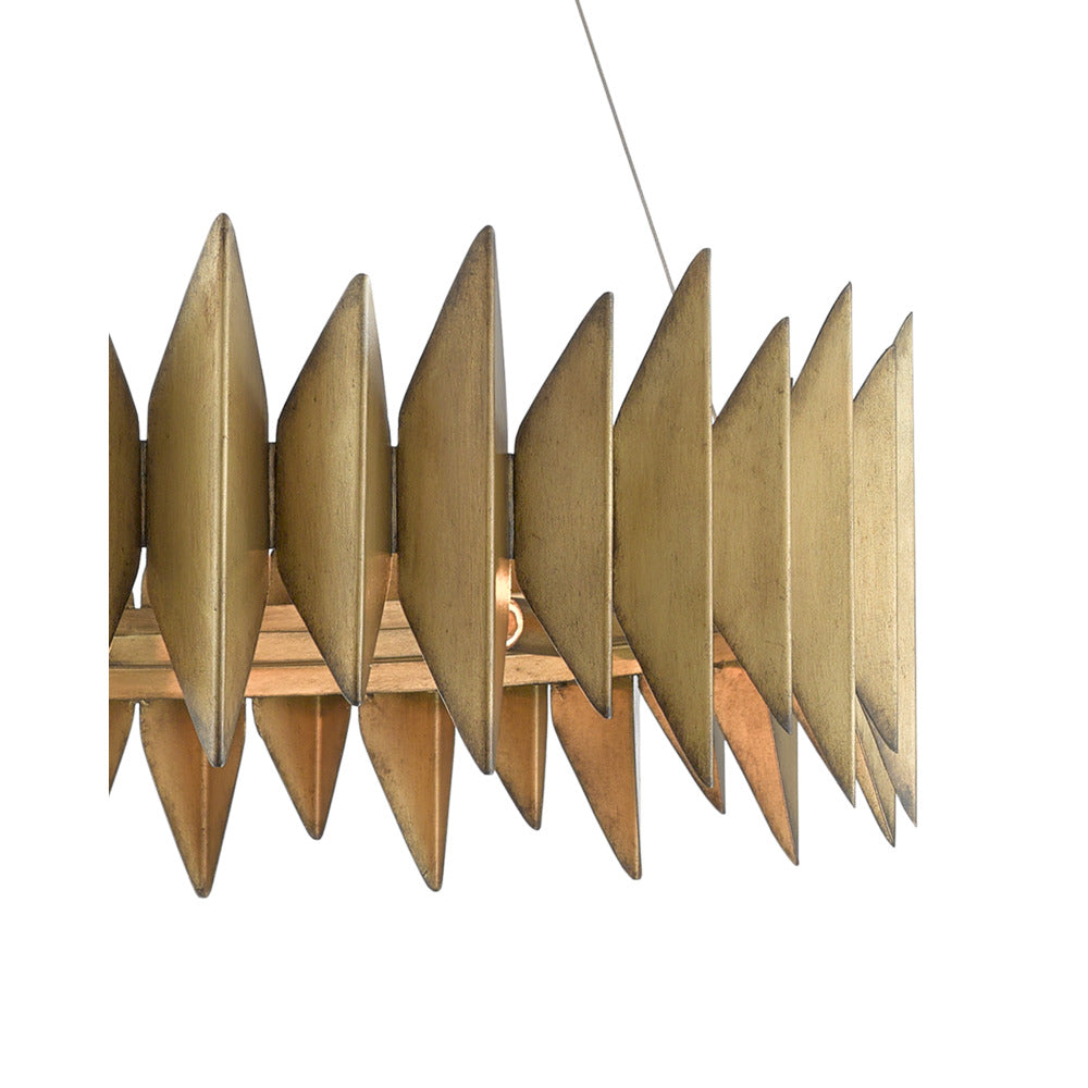 Brutalist design and desert yucca inspired the sculptural Potter Chandelier envisioned by Denise McGaha. The gold chandelier, made of wrought iron in an Aurora antique finish, brings texture to a space with its spiked extensions that flow along in graduating heights.