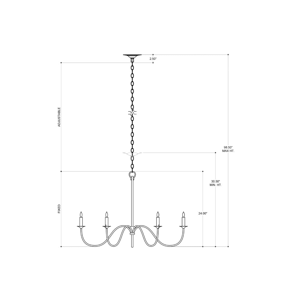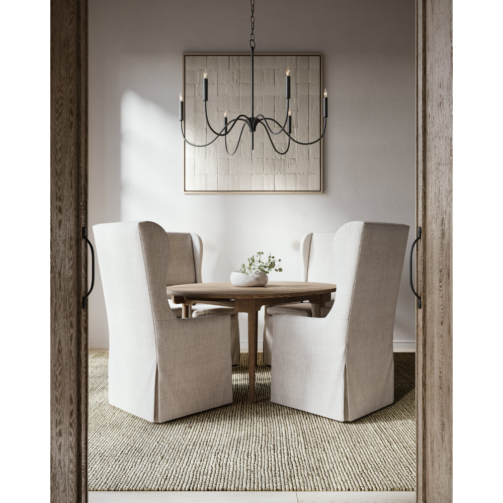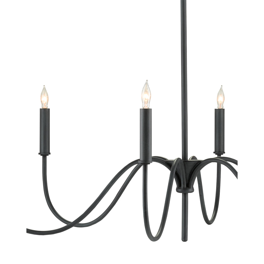 A nod to Early American style, the Tirrell Large Chandelier has graceful arms that arc upward to hold its candle sleeves with simple dignity. The black chandelier is made of wrought iron in an antique black finish. We also offer the Tirrell in medium and small sizes.