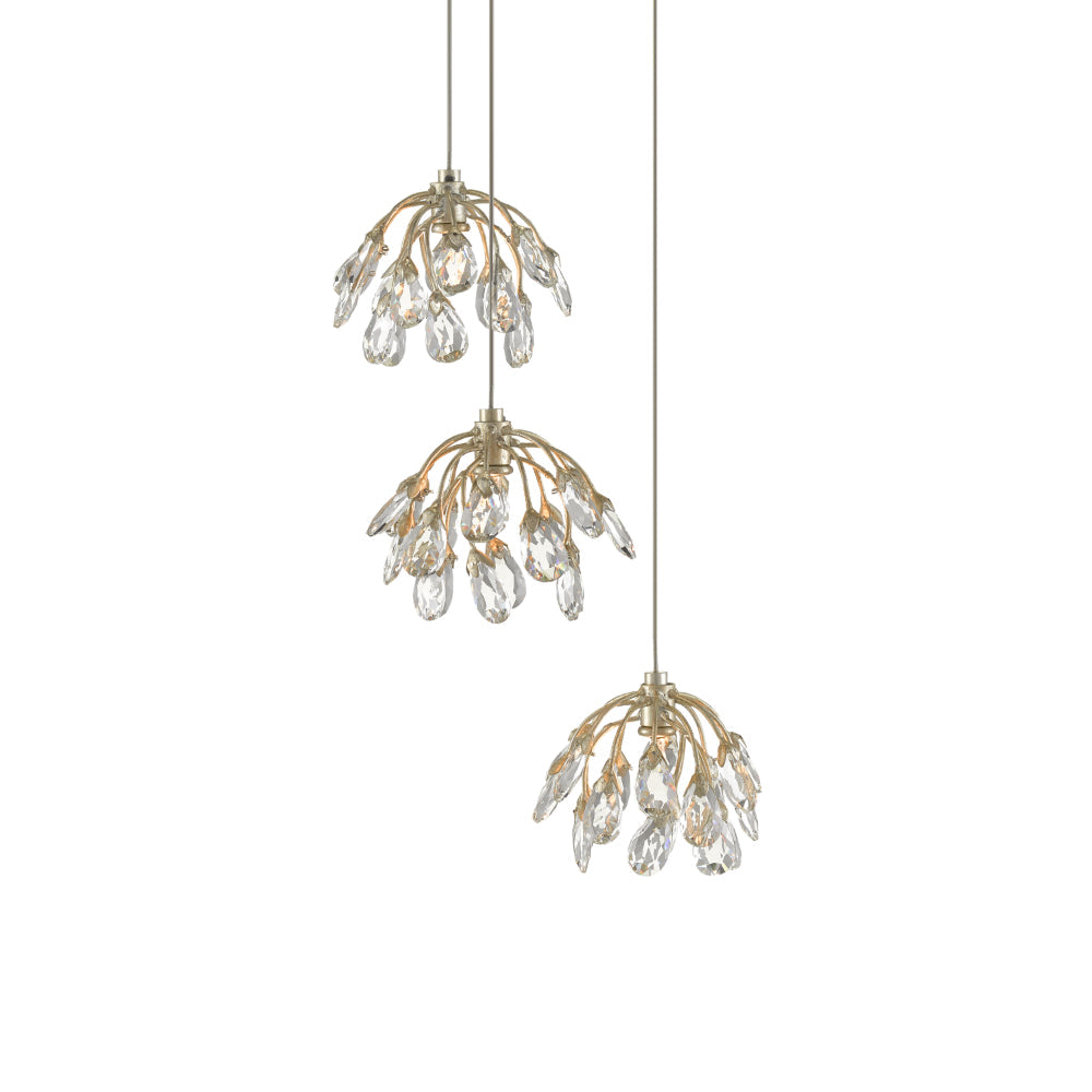 The Crystal Bud 3-Light Multi-Drop Pendant dangles flowers made of delicate faceted crystals from its canopy to make the shades effervescent and graceful. The silver pendant is luminous in its mix of painted silver and contemporary silver leaf finishes. This fixture is among Currey & Company's introduction of cluster lights, which includes 1-light up to 36-light configurations. We also have a number of chandeliers and orbs, and a wall sconce in this family of fixtures.