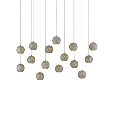 Our Giro Rectangular 15-Light Multi-Drop Pendant has metal shades that are pierced by hand; the textural globes in a mix of painted silver and nickel finishes on point for modern farmhouse interiors. Small blue beads placed in some of the piercings add a lovely color to the silver pendant as light strikes them. This fixture is among Currey & Company's introduction of cluster lights, which includes 1-light up to 36-light configurations.
