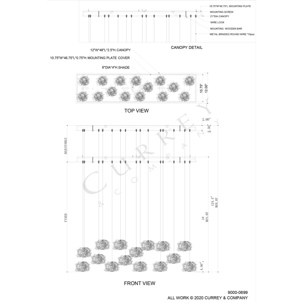 The Birds Nest Rectangular 15-Light Multi-Drop Pendant is an effervescent beaded pendant that looks like luminous nests. Rather than twigs, the shades are made up of whorls of clear beads strung along pieces of wire. It takes many hours for our artisans to create these shades that look so whimsical. This fixture is among Currey & Company's introduction of cluster lights, which includes 1-light up to 36-light configurations.