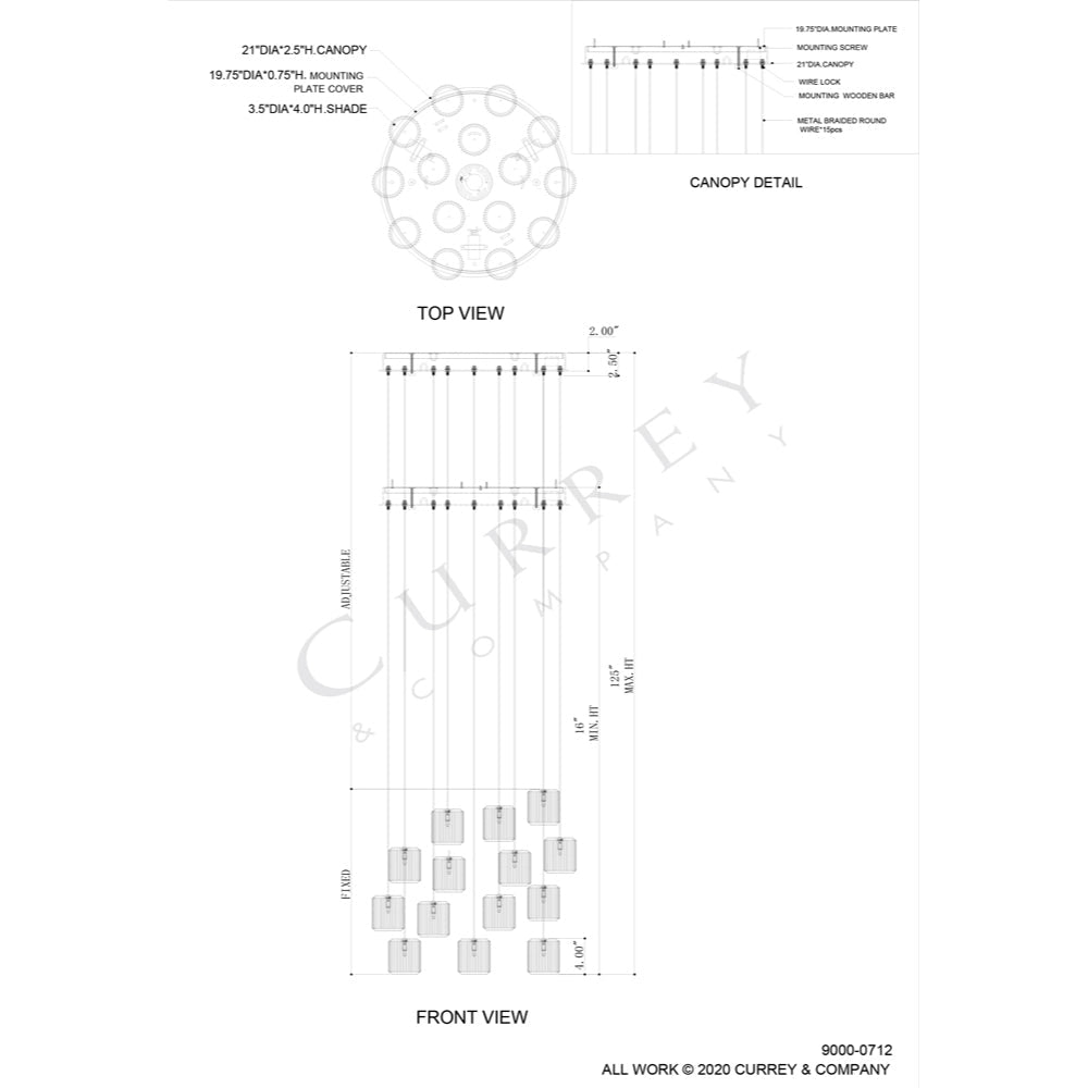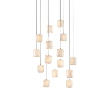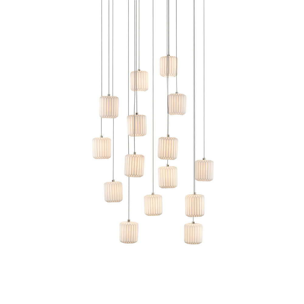 The Dove Round 15-Light Multi-Drop Pendant has pleated shades made of pale ceramic that diffuse the light wafting through them. The indentions and ridges on the shades of the white pendant bring a textural feel to this luminary even though it is monochromatic. This fixture is among Currey & Company's introduction of cluster lights, which includes 1-light up to 36-light configurations.