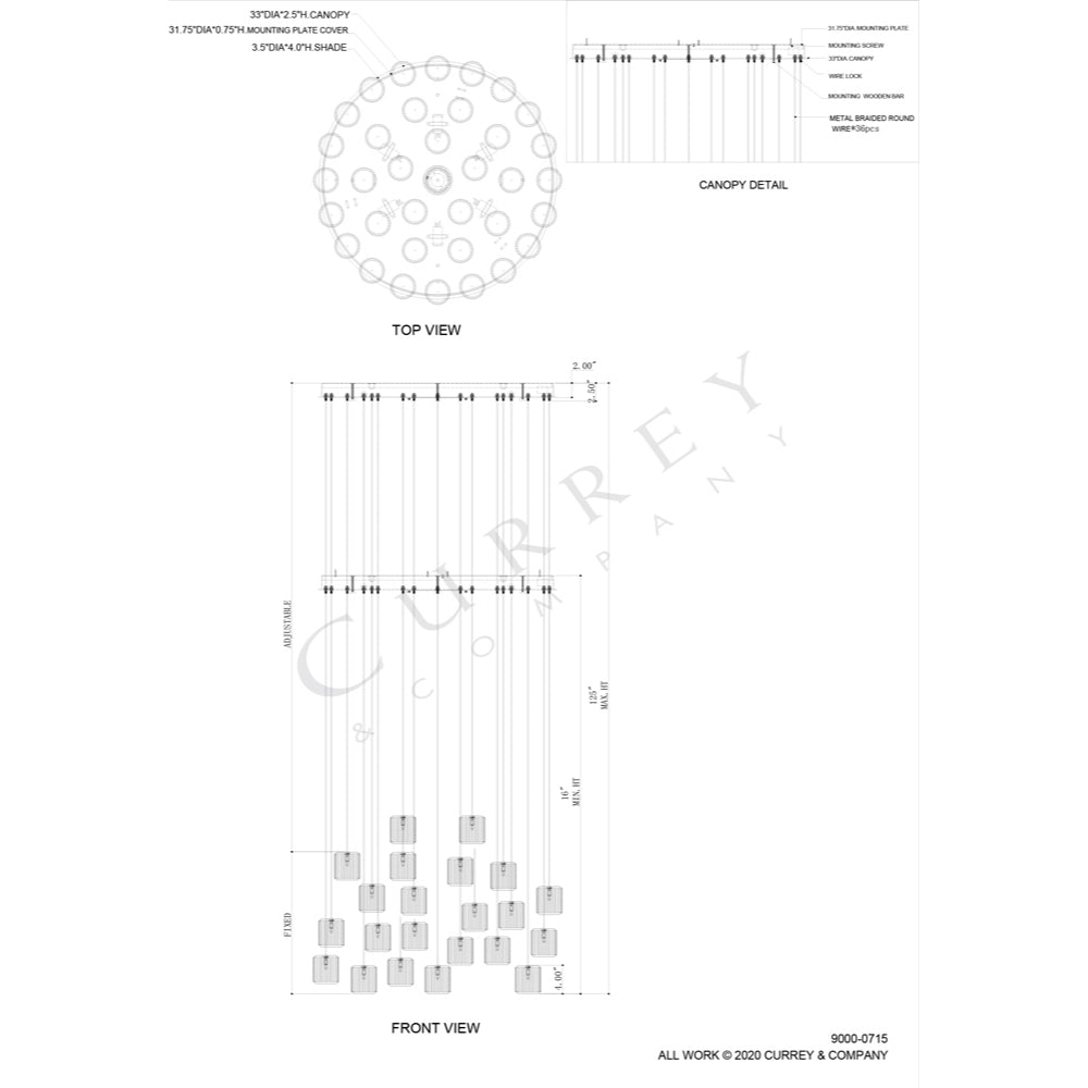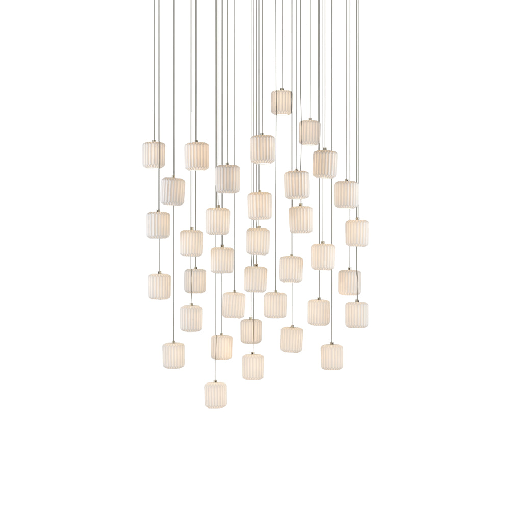 The Dove 36-Light Multi-Drop Pendant has pleated shades made of pale ceramic that diffuse the light wafting through them. The indentions and ridges on the shades of the white pendant bring a textural feel to this luminary even though it is monochromatic. This fixture is among Currey & Company's introduction of cluster lights, which includes 1-light up to 36-light configurations.