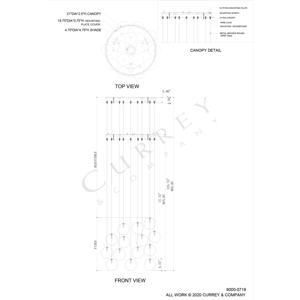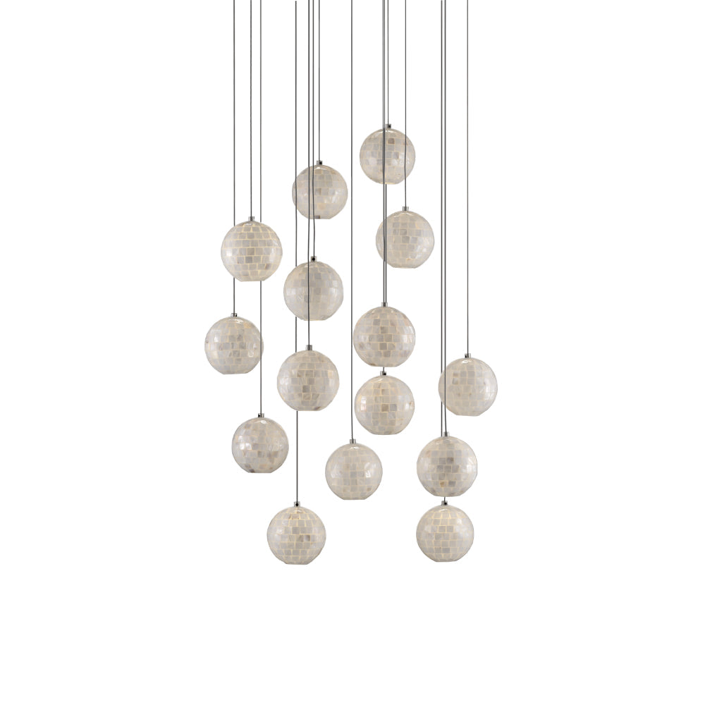 The Finhorn Round 15-Light Multi-Drop Pendant has orb-shaped shades covered with small squares of mother of pearl, painstakingly hand-applied. The stem and canopy of the white pendant light are in a painted silver finish to keep the composition light. This fixture is among Currey & Company's introduction of cluster lights, which includes 1-light up to 36-light configurations. We also offer the Finhorn in an orb pendant.