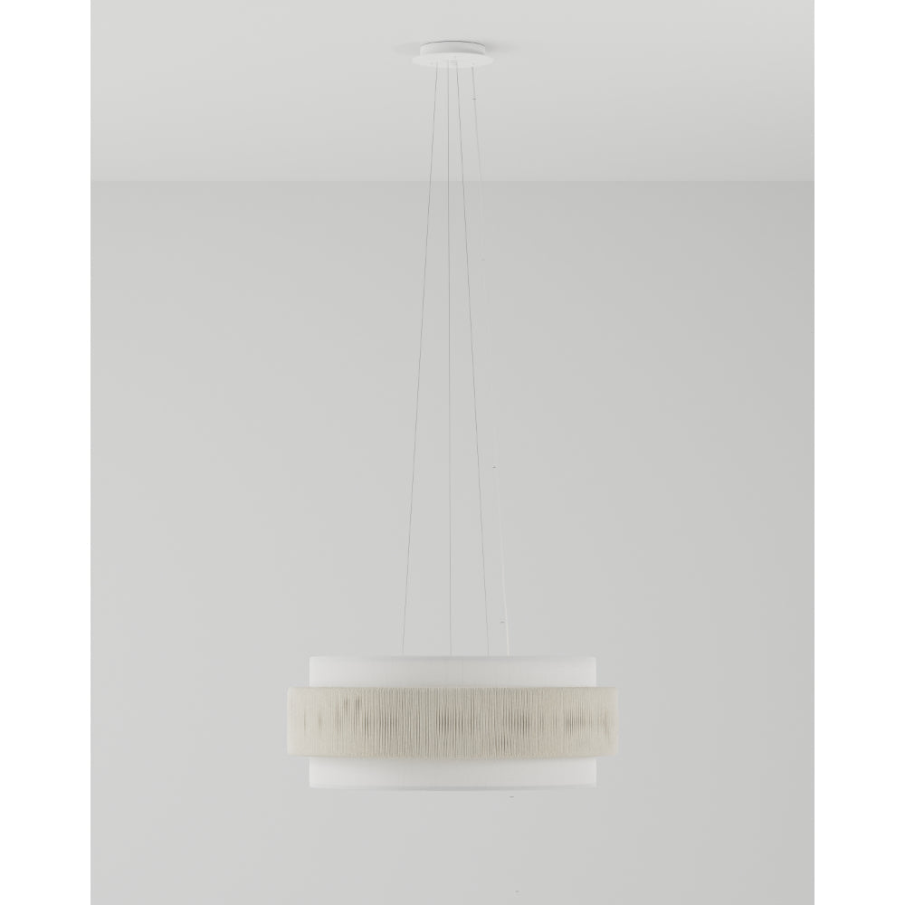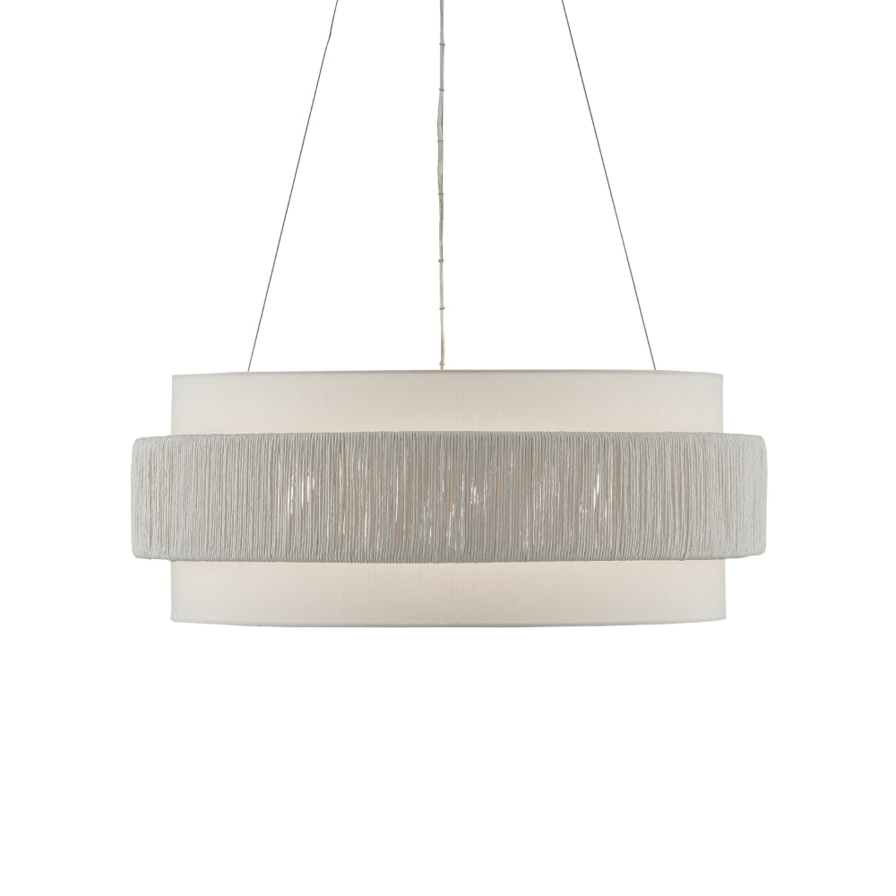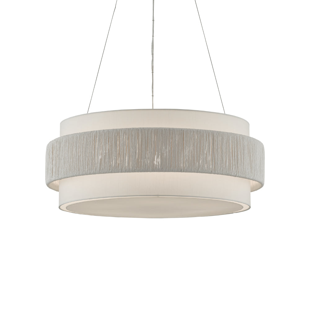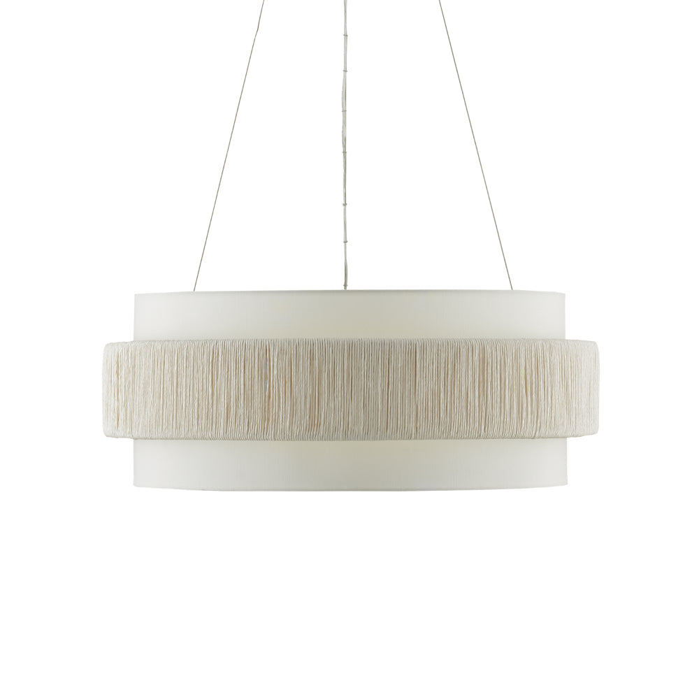 Our Rousham Chandelier, designed by Clarence Mallari, has an unusual accent on its fabric shade created by the twine panel made from recycled paper that is twisted and tightly wrapped around a metal frame. The panel made from the sustainable material, which is affixed to the center of the shade, is then coated with a sealant to protect it from moisture. The beige chandelier is suspended with aircraft cable and has a sugar white finish on the interior of the shade, which brightens the light.