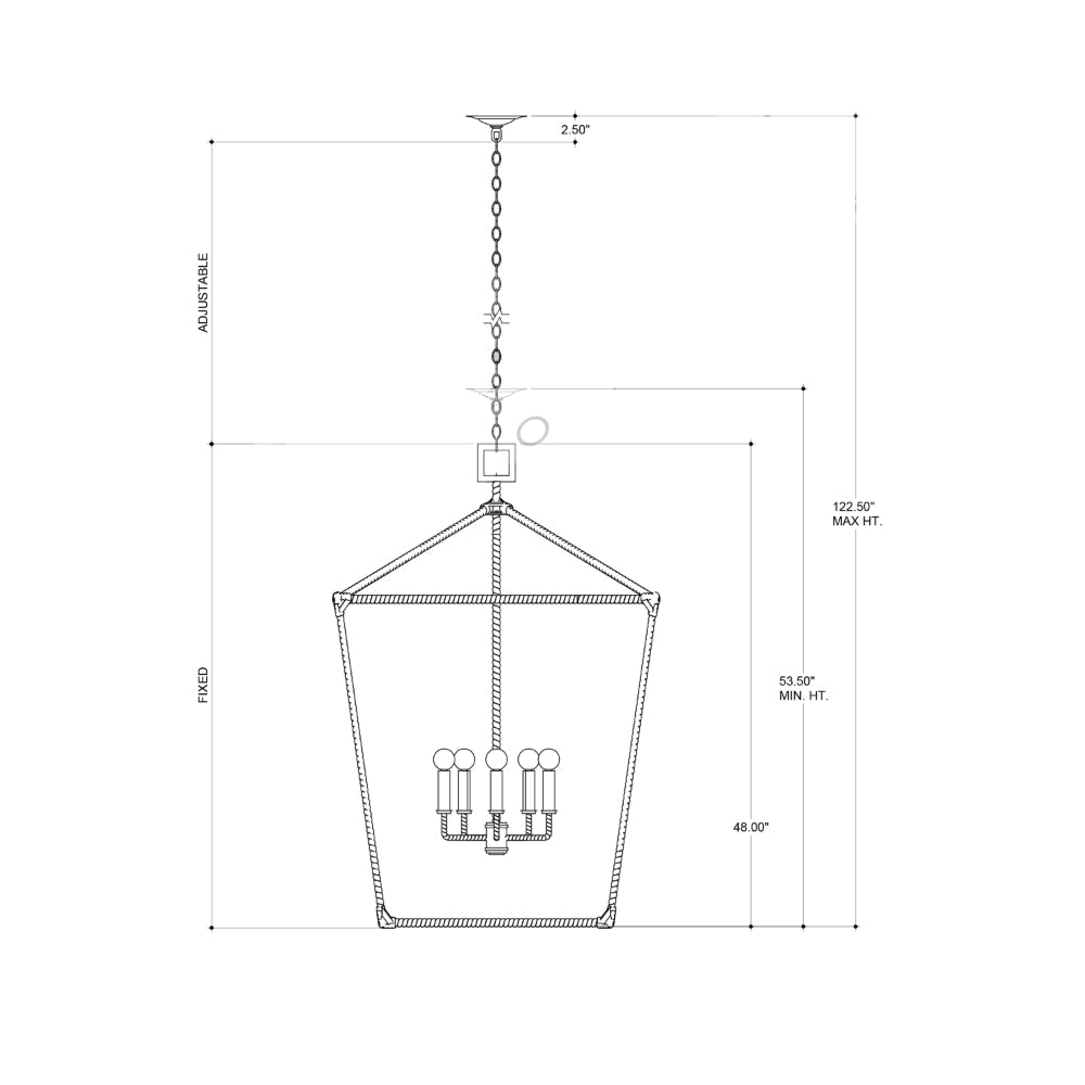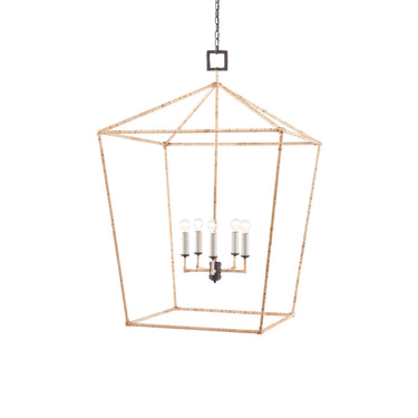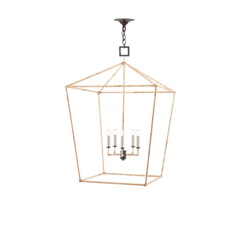 The Denison Rattan Grande Chandelier is a hammered wrought-iron fixture in a Mole black finish that is wrapped in rattan. The classic lantern shape has stood the test of time to make it one of our most popular offerings. A design element of note is the square that fastens the chandelier to the chain. This is one of a number of sizes and finishes in the Denison family.