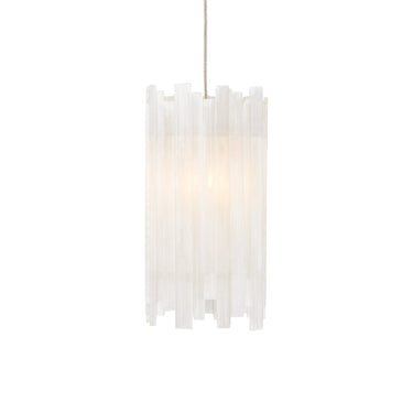 The Escenia 7-Light Multi-Drop Pendant has shades made of natural selenite. The ribs of the essential natural material are staggered top and bottom, which brings the shape of the shades added interest. The metal stems in a painted silver finish are thin so that the shades seem to float. When the lights are switched on, a beautiful glow is created by the crystal bars. We offer the Escenia in a number of different configurations with multiple shades.