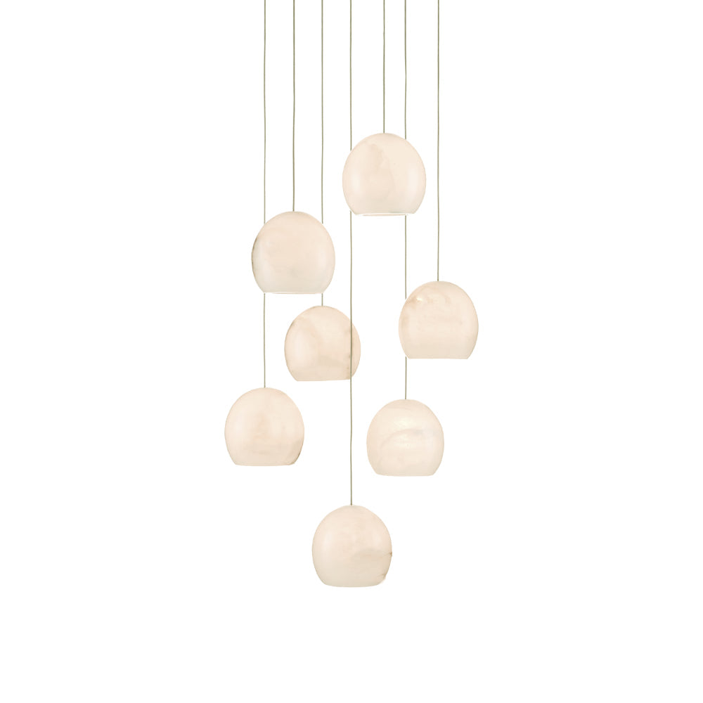The Lazio 7-Light Multi-Drop Pendant has luminous shades carved from natural alabaster. The veining in the material makes each shade unique because each stone taken from the earth will have its own personality. The shape of the shade and the thinness of the stem on which it dangles are of the simplest in form. This leaves the natural material to shine. The painted silver finish also helps to keep the design light and airy. We offer the Lazio in a number of different configurations with multiple shades.
