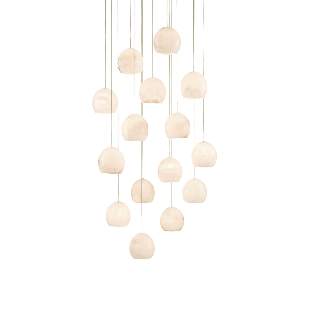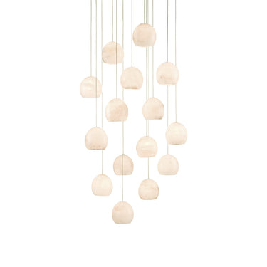 The Lazio Round 15-Light Multi-Drop Pendant has luminous shades carved from natural alabaster. The veining in the material makes each shade unique because each stone taken from the earth will have its own personality. The shape of the shade and the thinness of the stem on which it dangles are of the simplest in form. This leaves the natural material to shine. The painted silver finish also helps to keep the design light and airy. We offer the Lazio in a number of different configurations with multiple shades.