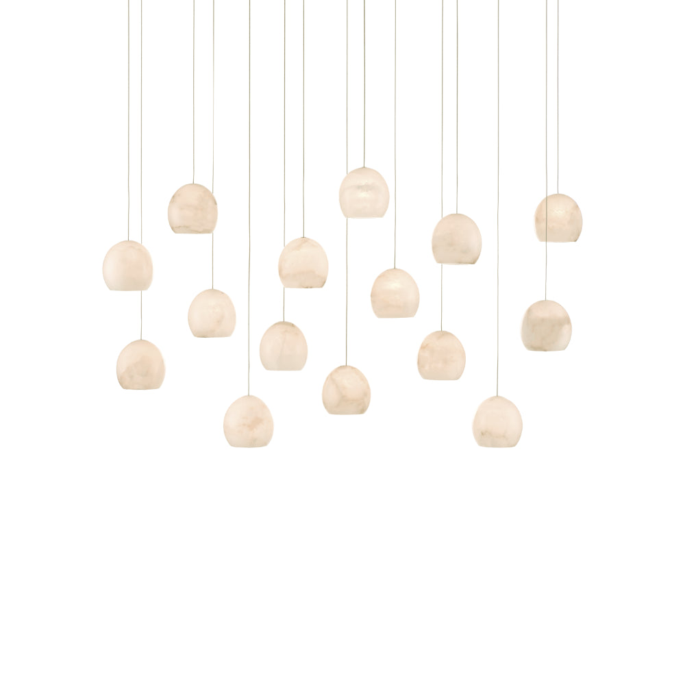 The Lazio Rectangular 15-Light Multi-Drop Pendant has luminous shades carved from natural alabaster. The veining in the material makes each shade unique because each stone taken from the earth will have its own personality. The shape of the shade and the thinness of the stem on which it dangles are of the simplest in form. This leaves the natural material to shine. The painted silver finish also helps to keep the design light and airy. We offer the Lazio in a number of different configurations with multiple shades.
