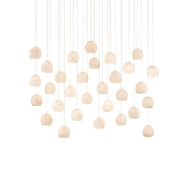 The Lazio 30-Light Multi-Drop Pendant has luminous shades carved from natural alabaster. The veining in the material makes each shade unique because each stone taken from the earth will have its own personality. The shape of the shade and the thinness of the stem on which it dangles are of the simplest in form. This leaves the natural material to shine. The painted silver finish also helps to keep the design light and airy. We offer the Lazio in a number of different configurations with multiple shades.