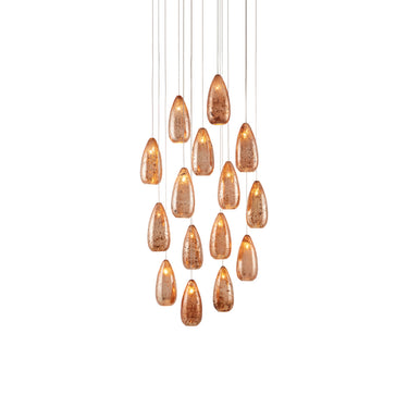 The Rame Round 15-Light Multi-Drop Pendant has teardrop shaped shades made of mercury glass with silver on the inside and copper on the outside. The personality of the patterns on the glass is evident whether the lights are switched on or not but when illumination brightens the shades, the effect is dazzling. The thinness of the stems on which they hang and the lightness of the painted silver finish make the oblong shades seem to float. We offer the Rame in a number of different configurations with multiple shades.