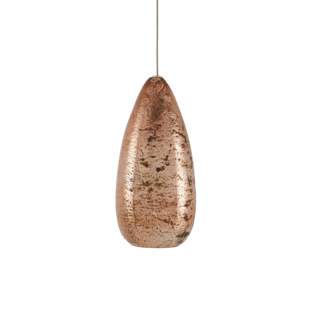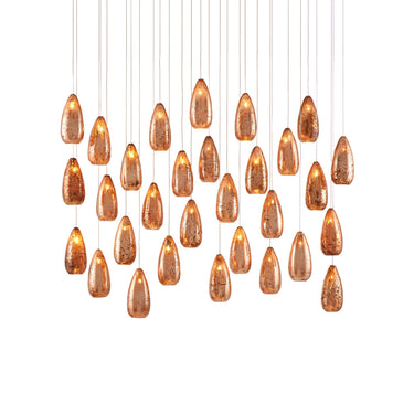 The Rame 30-Light Multi-Drop Pendant has teardrop shaped shades made of mercury glass with silver on the inside and copper on the outside. The personality of the patterns on the glass is evident whether the lights are switched on or not but when illumination brightens the shades, the effect is dazzling. The thinness of the stems on which they hang and the lightness of the painted silver finish make the oblong shades seem to float. We offer the Rame in a number of different configurations with multiple shades.