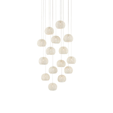 The shades on the Piero Round 15-Light Multi-Drop Pendant may appear to be woven from a natural plant material, but they are made of iron in a white finish to make it one of our offerings that illustrates the skills our craftspeople bring to their work. When the white pendant is illuminated, textural patterns will enliven surrounding surfaces. We also offer this design in chandeliers in several sizes.