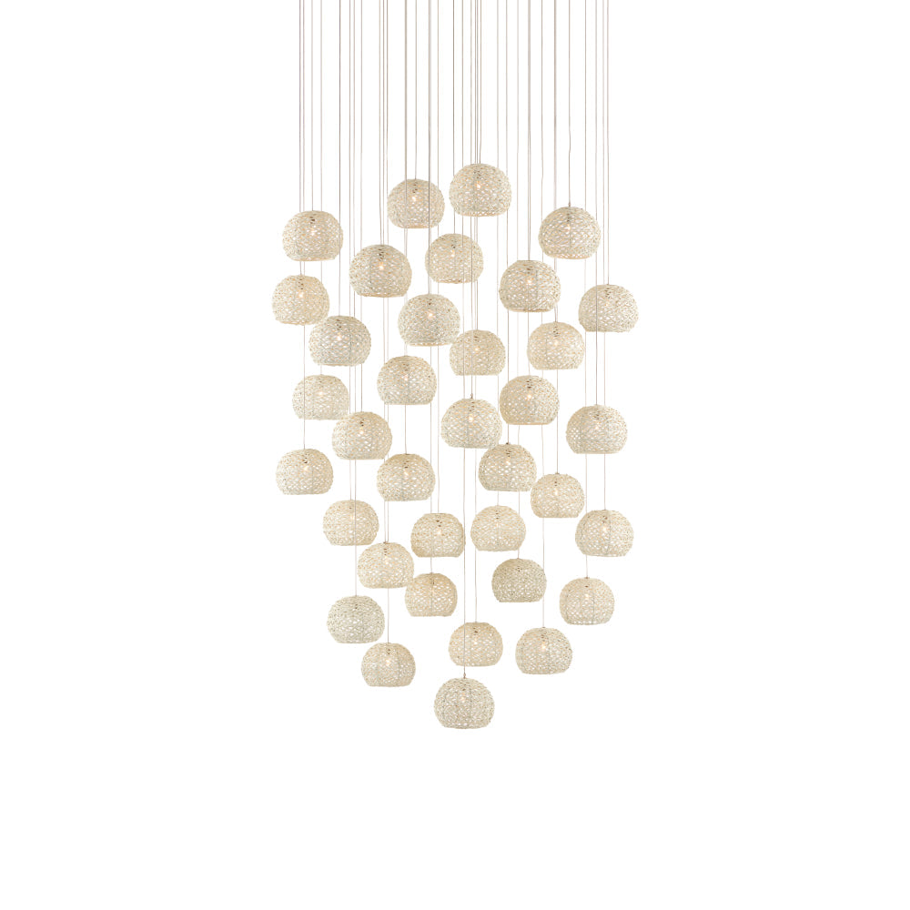 The shades on the Piero 36-Light Multi-Drop Pendant may appear to be woven from a natural plant material, but they are made of iron in a white finish to make it one of our offerings that illustrates the skills our craftspeople bring to their work. When the white pendant is illuminated, textural patterns will enliven surrounding surfaces. We also offer this design in chandeliers in several sizes.