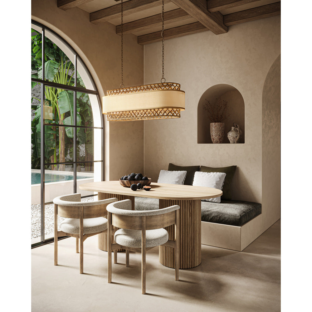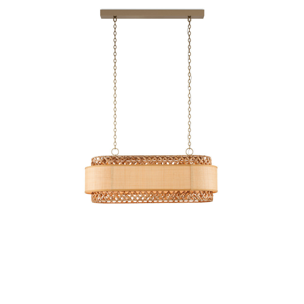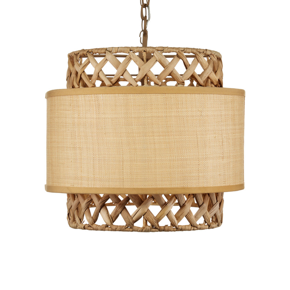 The natural material story continues with the Isola Chandelier with its wrought iron frame in a khaki finish and mix of natural water hyacinth and Grass Cloth fabric. Designed by Clarence Mallari, the smaller, taller oval that encircles the light has a rough luxe weave of the water hyacinth; while the wider, shorter oval has a tighter weave that juxtaposes the looser crosshatching on this tan chandelier. A design detail of note is that the seams match up when the outer shade transitions from straight to curved.