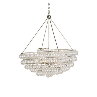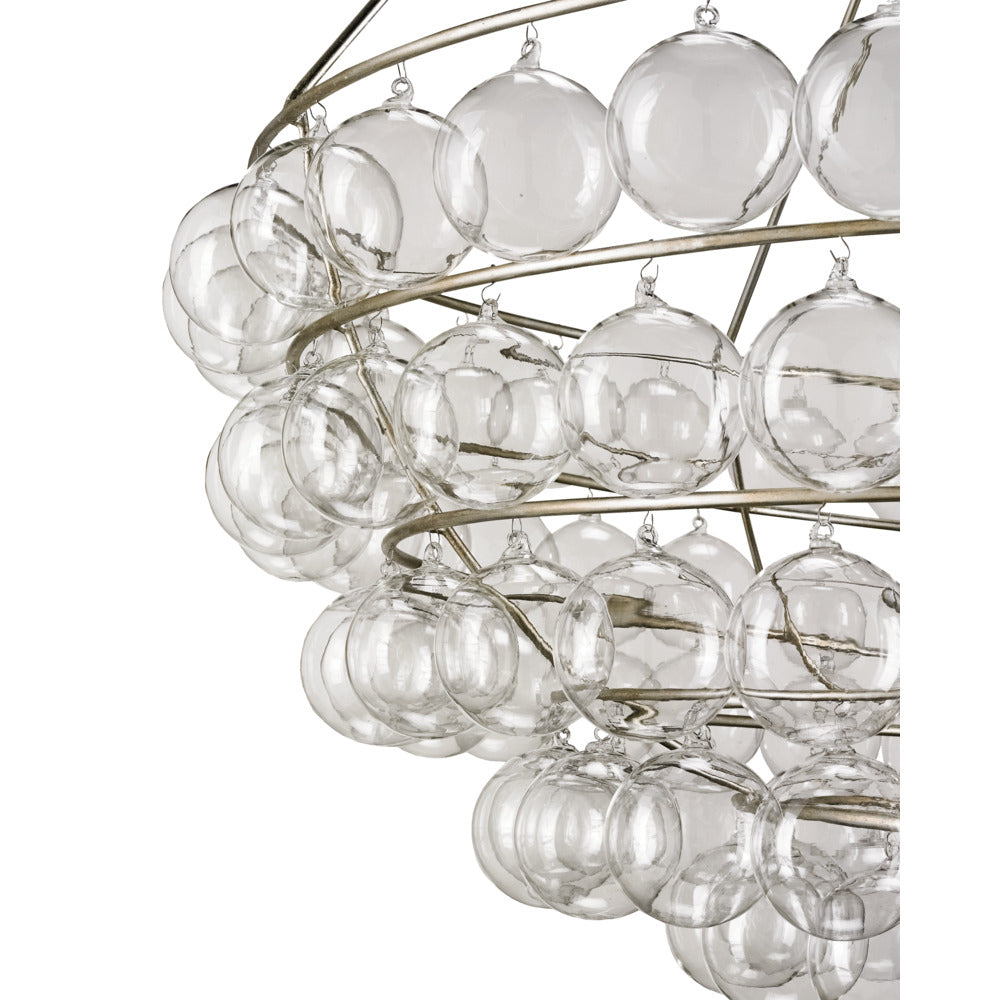 The striking Stratosphere Chandelier makes a brilliant statement, both in size and in the allure reflected from its ethereal elements. Blown glass balls gleam with reflected light as they circle down the simple wrought iron frame. Adding to the sheen of the silver pendant is a contemporary silver leaf finish.