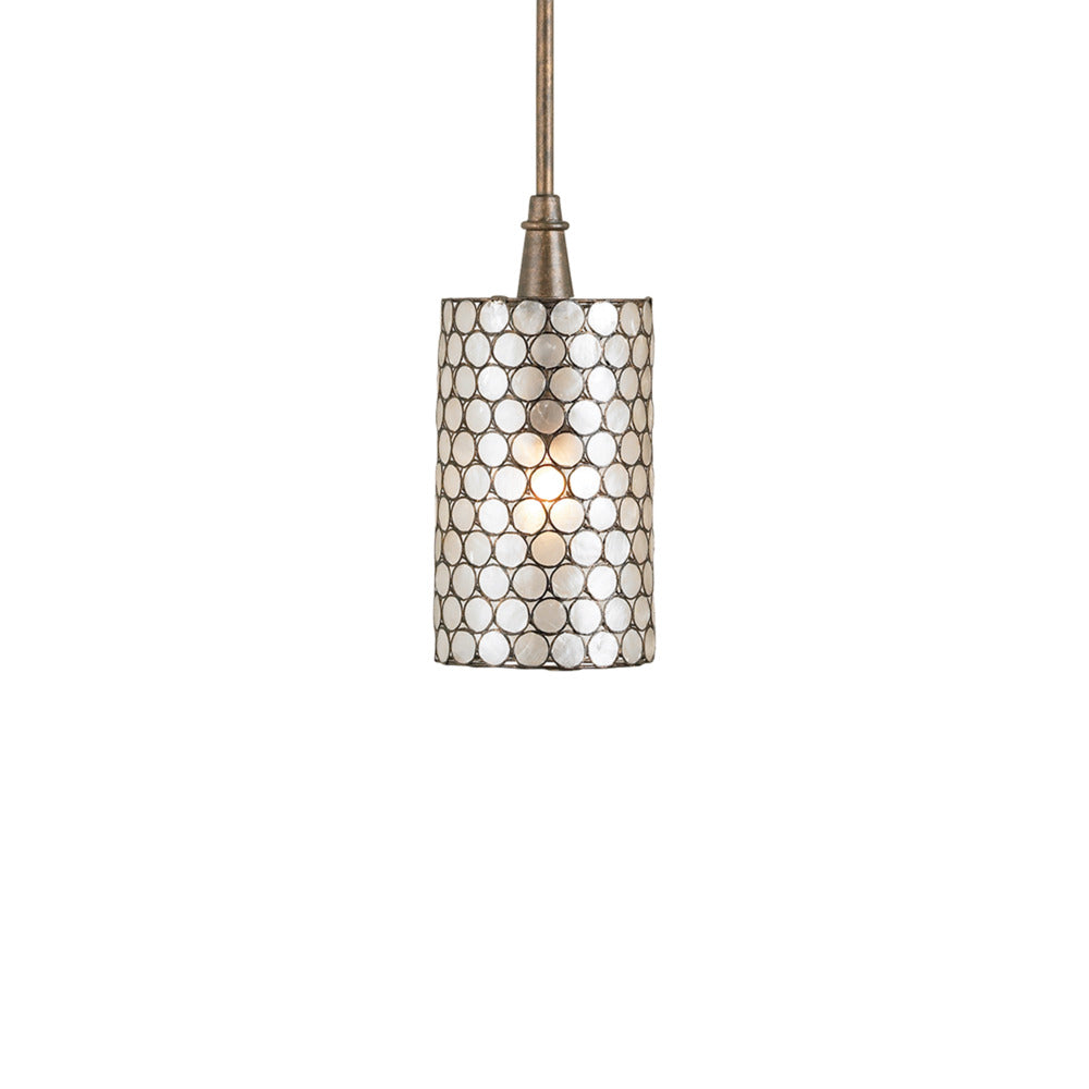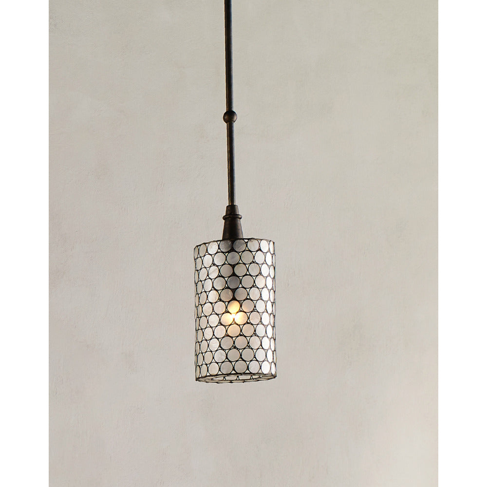 Natural Capiz shell and wrought iron in a Cupertino finish create a luminous circular pattern on the shade of the Regatta Pendant. The cylindrical pendant has such a pleasing glow when light shines through the lustrous shade. Given its petite size, the shell pendant is perfect for grouping or hanging in rows.