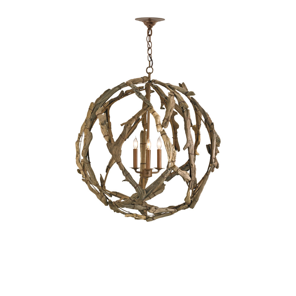 Currey & Company 9078 Driftwood Orb 3 Light Chandelier in Natural/Washed Driftwood