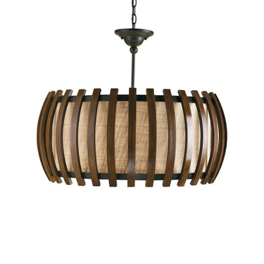 Expressing a mid-century modern paradigm, the Dado Pendant has a rounded cage of a body made of softly curved vertical slats in a gleaming polished fruitwood finish. The wood pendant surrounds a rustic but stylish putty burlap diffuser that softens the fixture's glow.