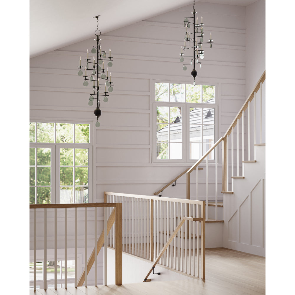 The Sethos Large Chandelier has a linear wrought iron frame in an old iron finish that refences early American antiques. This and the discs of recycled glass dangling from its arms bring the black chandelier a nostalgic feel. We offer the Sethos in a number of designs and in a variety of finishes.