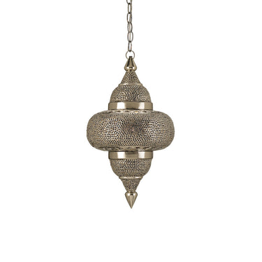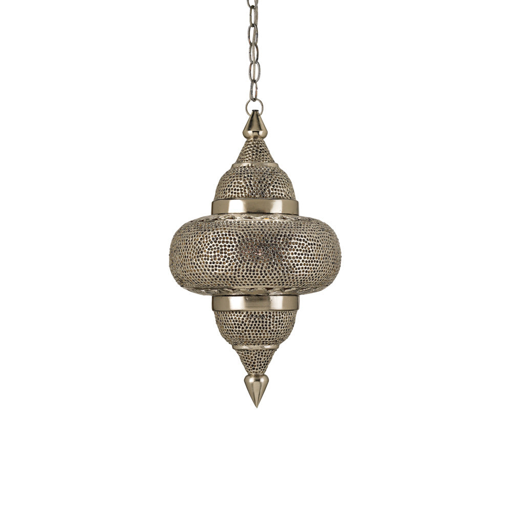 The Tangiers Pendant is awash in ethnic design details. The metal is pierced by hand and plated with copper and nickel finishes before a final coating of lacquer is applied. Small amber beads placed in some of the piercings add a lovely color to the silver pendant as light strikes them.