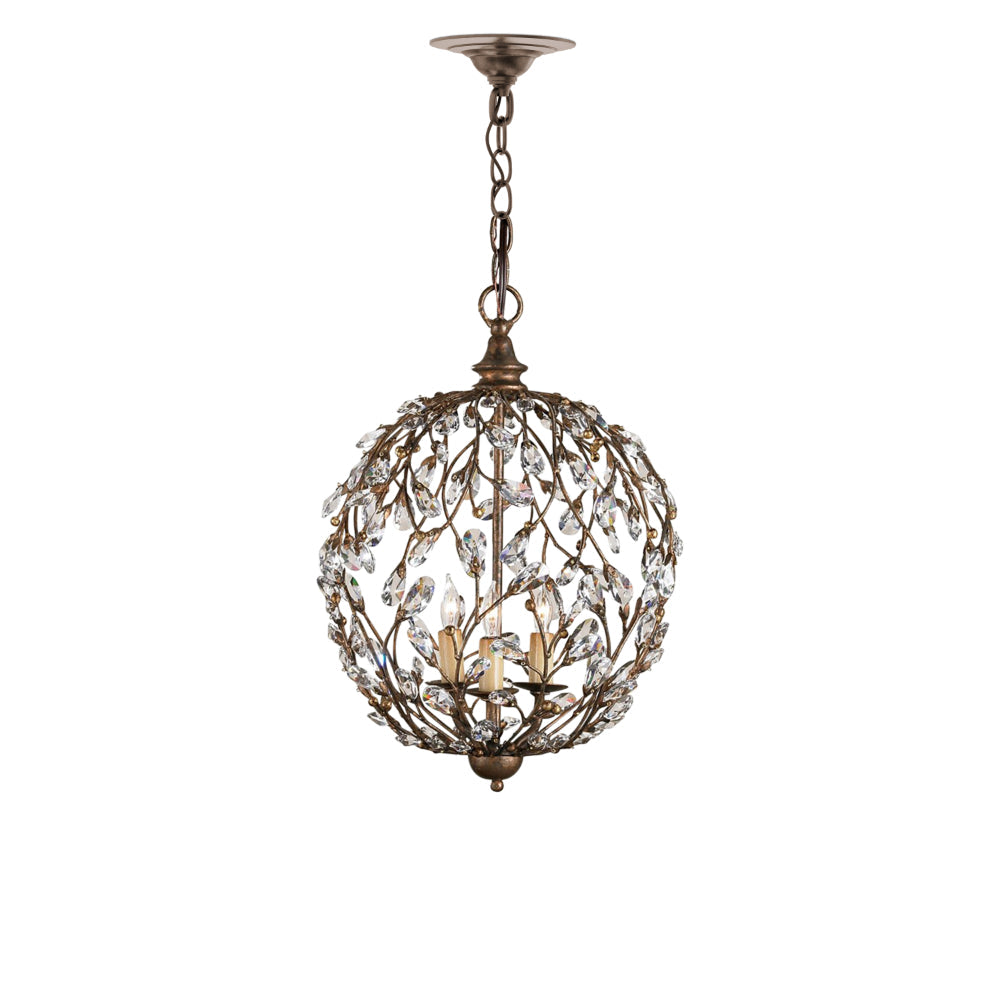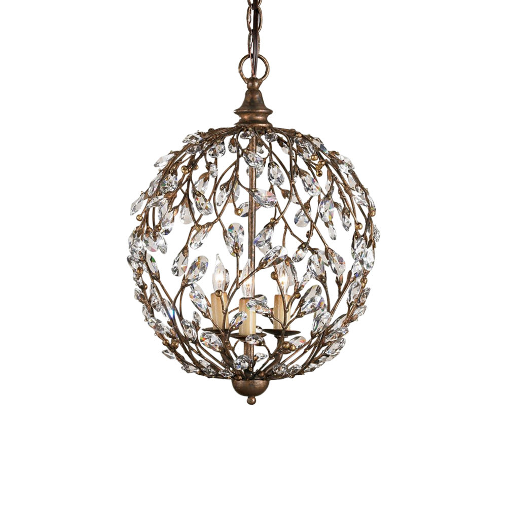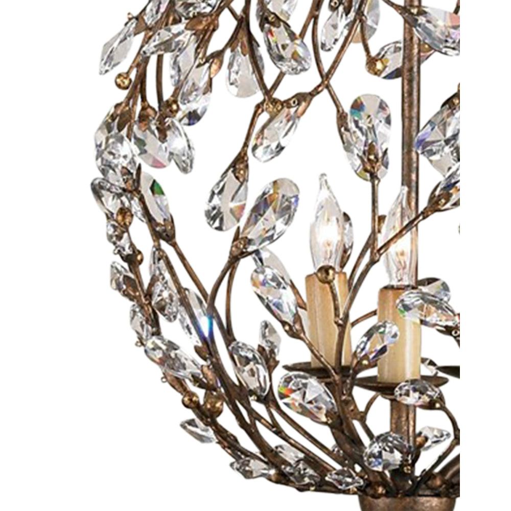 The Crystal Bud Cupertino Orb Chandelier has delicate faceted crystals unfurling from vines that flow along its globe-like body. The rust-colored metal in a Cupertino finish serves as a warm contrast to the luminous glass, the interplay making the profile of this crystal chandelier complex. This is one of the fixtures in the varied Crystal Bud family of lights.