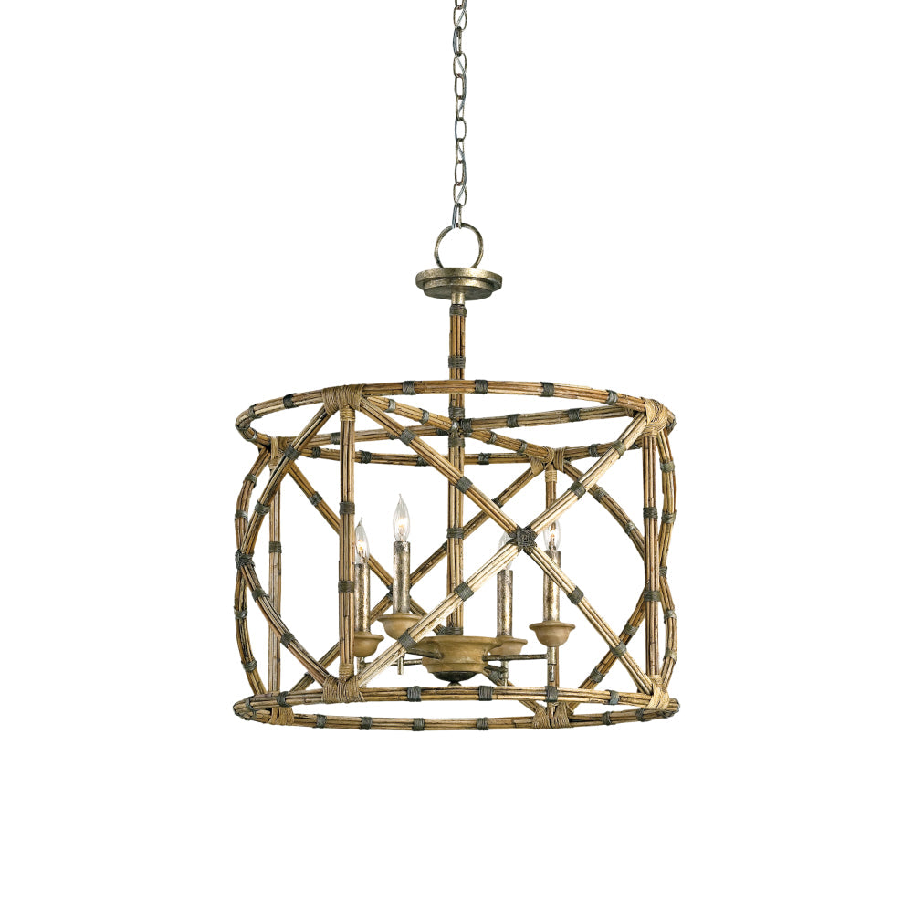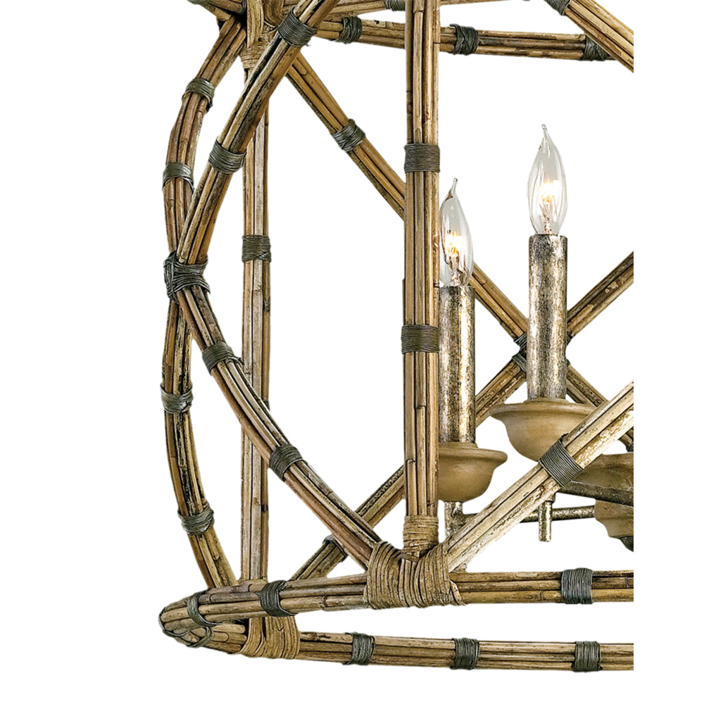 The Palm Beach Lantern is made of interconnecting stems of the Arurog plant. These are fastened to a wrought iron frame in a pattern that makes the natural material favor bamboo. Adding a bit of elegance to the graceful curves of this lantern is a Pyrite bronze finish on the metal. We also offer the Palm Beach in a chandelier.