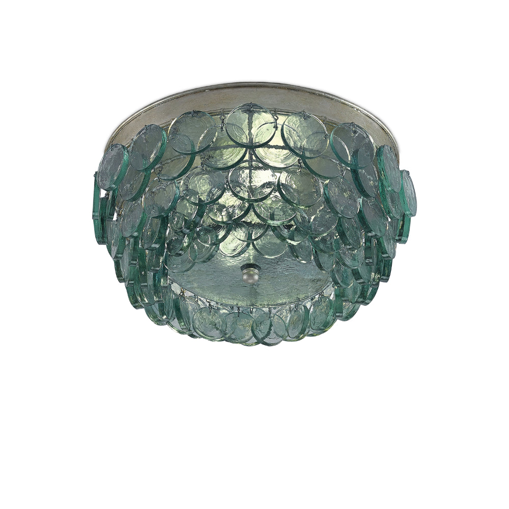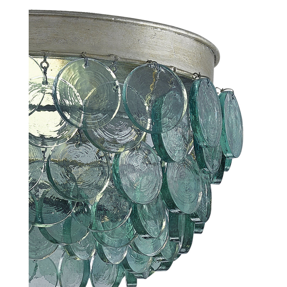 Recycled glass discs dangle from the Braithwell Flush Mount to form a textural shade. The discs vary in size and overlap on the wrought iron frame in a silver leaf finish of the to make this green glass flush-mount a mottled mosaic. We also offer the Braithwell in a chandelier.