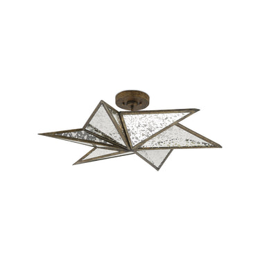 The distinctive shape of the Stargazer Semi-Flush is made of wrought iron in a Pyrite bronze finish inset with raj mirror panels. These are slanted in such a way as to give the ceiling light a sense of movement. The mirrored semi-flush will reflect illumination on or off.