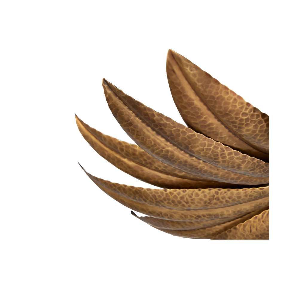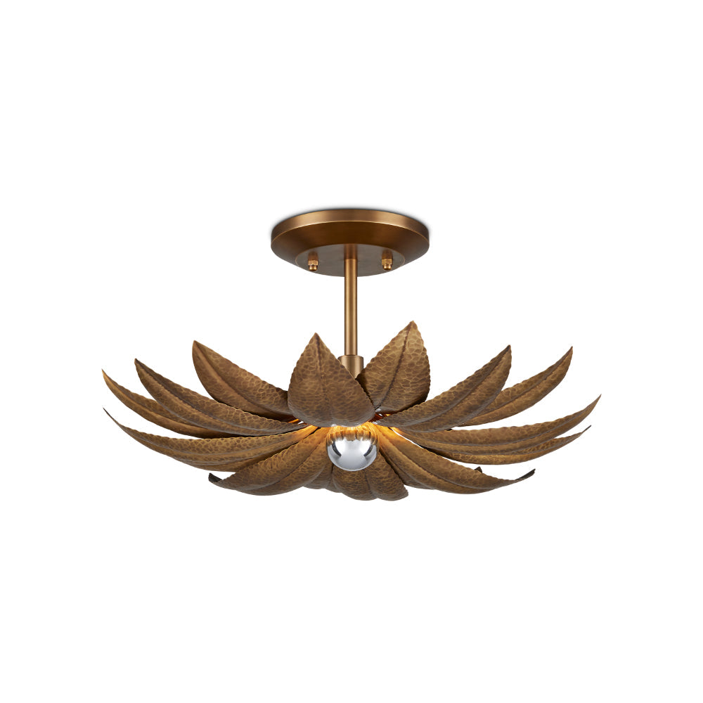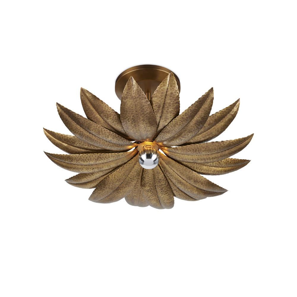 The Alithea Small Semi-Flush Mount is made of brass in an antique brass finish. The petals on this nature-inspired gold sconce have been hand-hammered to give them lifelike personality. This floral semi-flush will be a pretty addition to any space it illuminates. The button-like bulb brings the metal a luminous sheen.