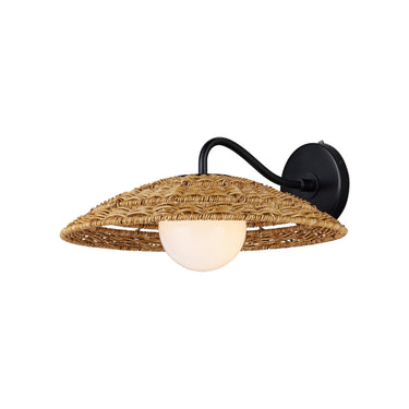 The Barbary Outdoor Wall Sconce blends craftsmanship with durability for elevated outdoor lighting. Its inverted bowl-shaped shade, handwoven from all-weather synthetic wicker, features a uniform tan weave that adds texture and warmth. A black powder-coated metal backplate and gooseneck arm offer a sleek contrast and long-lasting resilience. The milk-glass globe softly glows through a circular cutout in the shade, and it is wet-location tested.