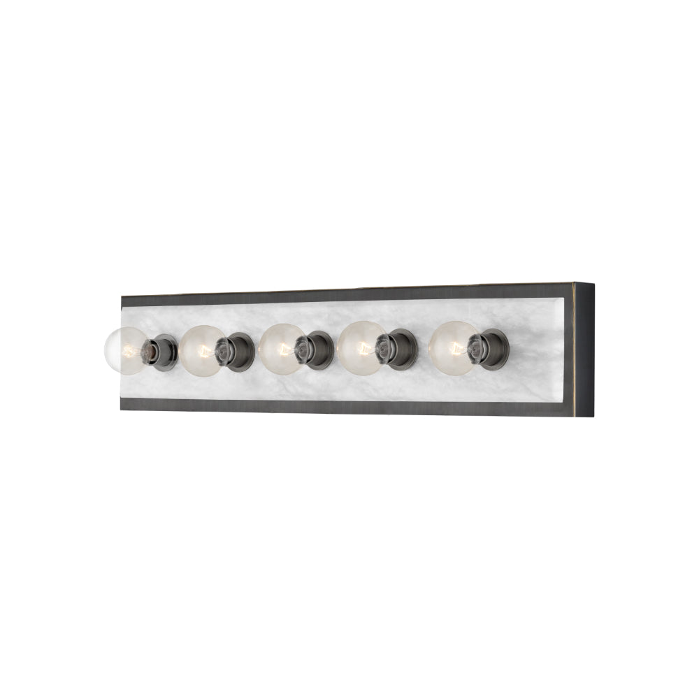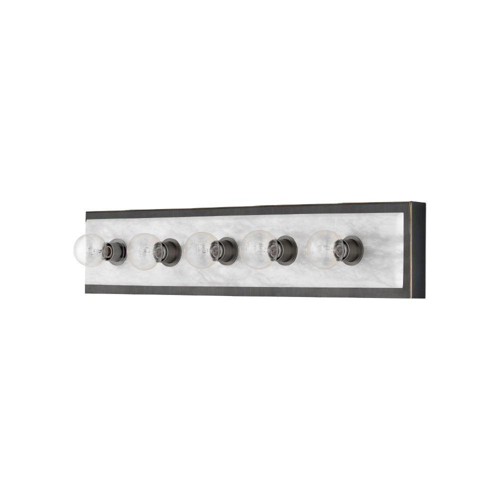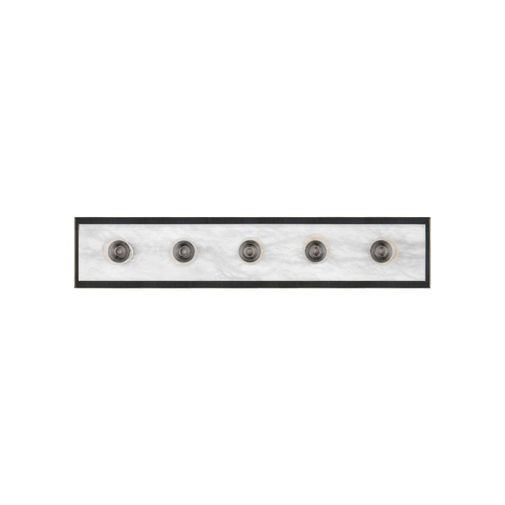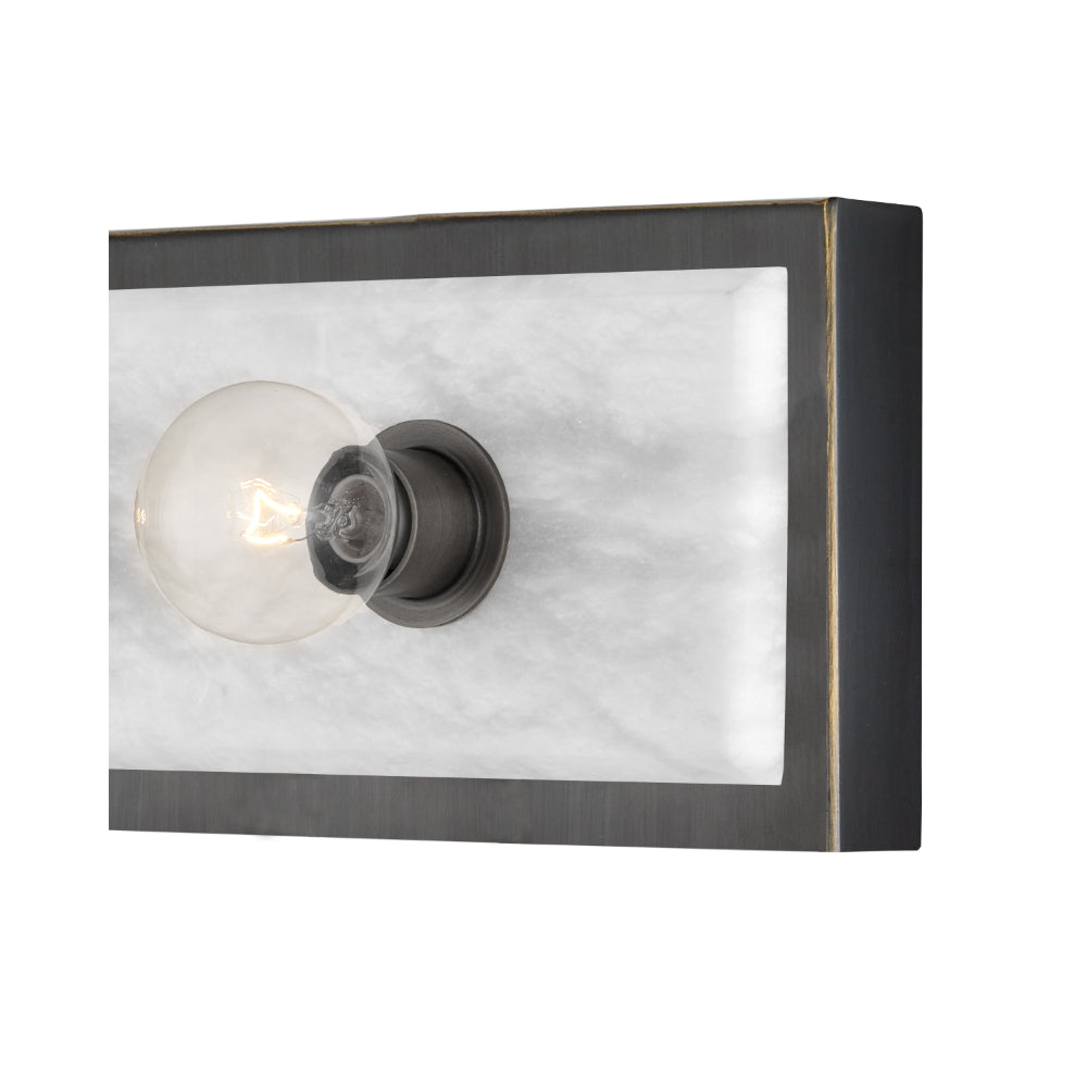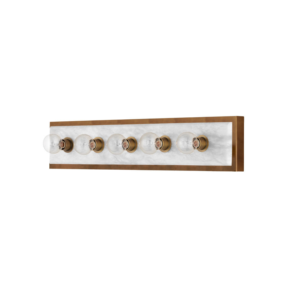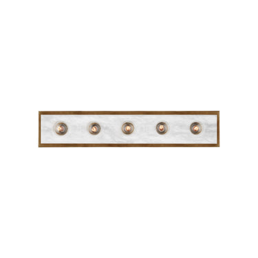 The Berdine Large Brass Bath Bar is a simple design that allows the natural alabaster to shine. Made of metal in an antique brass finish, the warmth of the gold contrasts the coolness of the stone to bring a subtle complexity to this design. It can be mounted vertically or horizontally, and the alabaster panel has a nice bevel to it where it meets the metal rim.