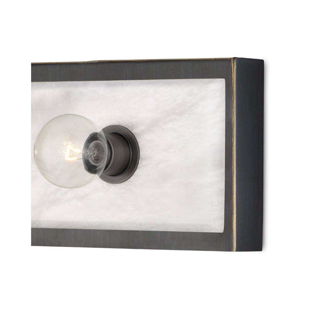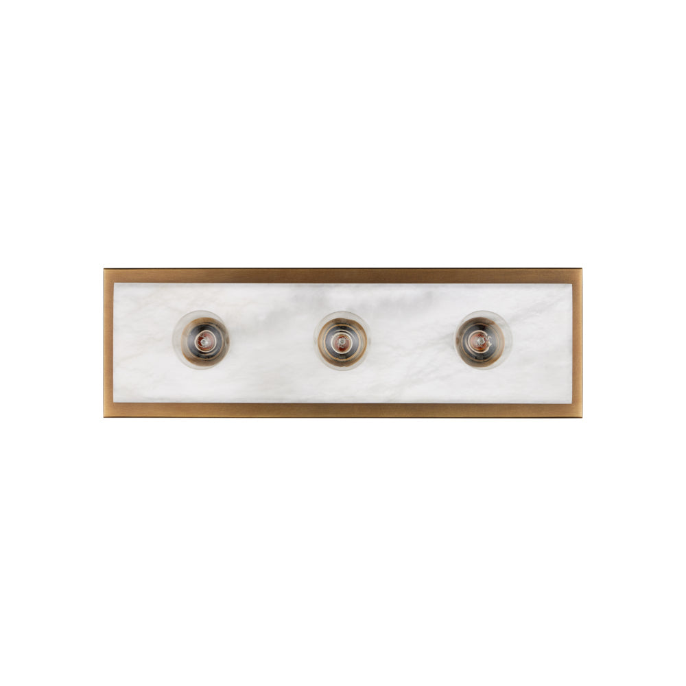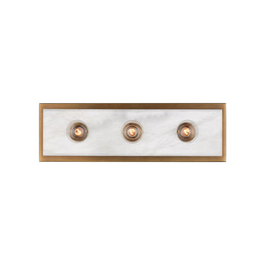 The Berdine Medium Brass Bath Bar is a simple design that allows the natural alabaster to shine. Made of metal in an antique brass finish, the warmth of the gold contrasts the coolness of the stone to bring a subtle complexity to this design. It can be mounted vertically or horizontally, and the alabaster panel has a nice bevel to it where it meets the metal rim.