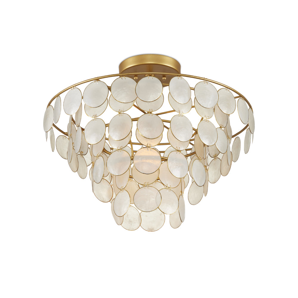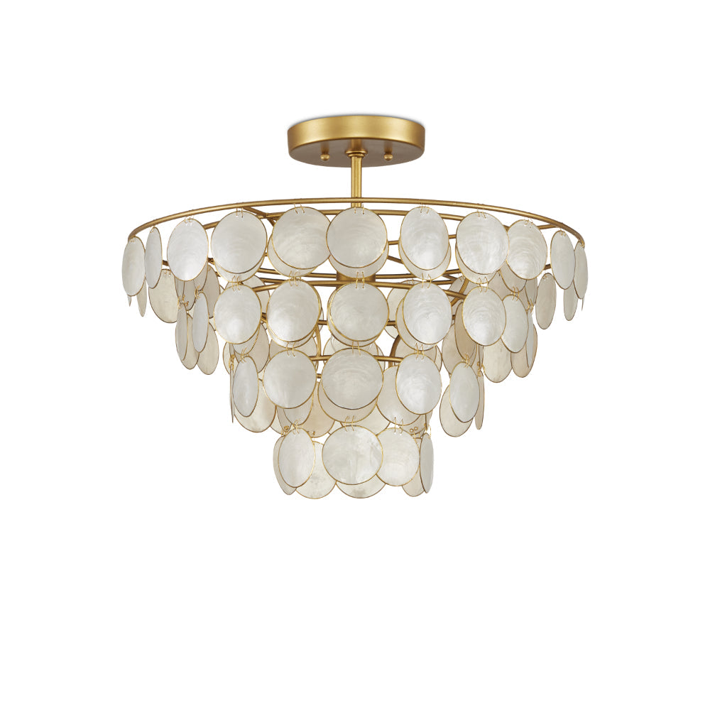 The Bon Vivant Small Semi-Flush Mount was designed to be ethereal in its make-up. The discs that effervesce with illumination are made of Capiz shells ringed with a decorative metal edge. These match the contemporary gold finish on the rest of the fixture. The thinness of the wires that fasten the discs to the frame and to each other is a sophisticated design detail. This gold semi-flush is convertible to a chandelier when the lower canopy is removed. Adjustable from 23.25" to 91.25" with use of included chain/rod kit/cable. If your space calls for a longer drop, additional chain/rods/cable is available for purchase.