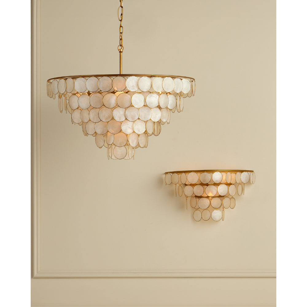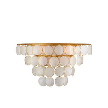 Ethereal in its vibe, the Bon Vivant Sconce features discs that effervesce with illumination, made of Capiz shells ringed in a decorative metal edge that matches the gold finish on the rest of the fixture. The delicate scale of the wires that fasten the discs to the frame and to each other is a sophisticated design detail. This gold and white wall sconce is a mid-century-modern inspired design.