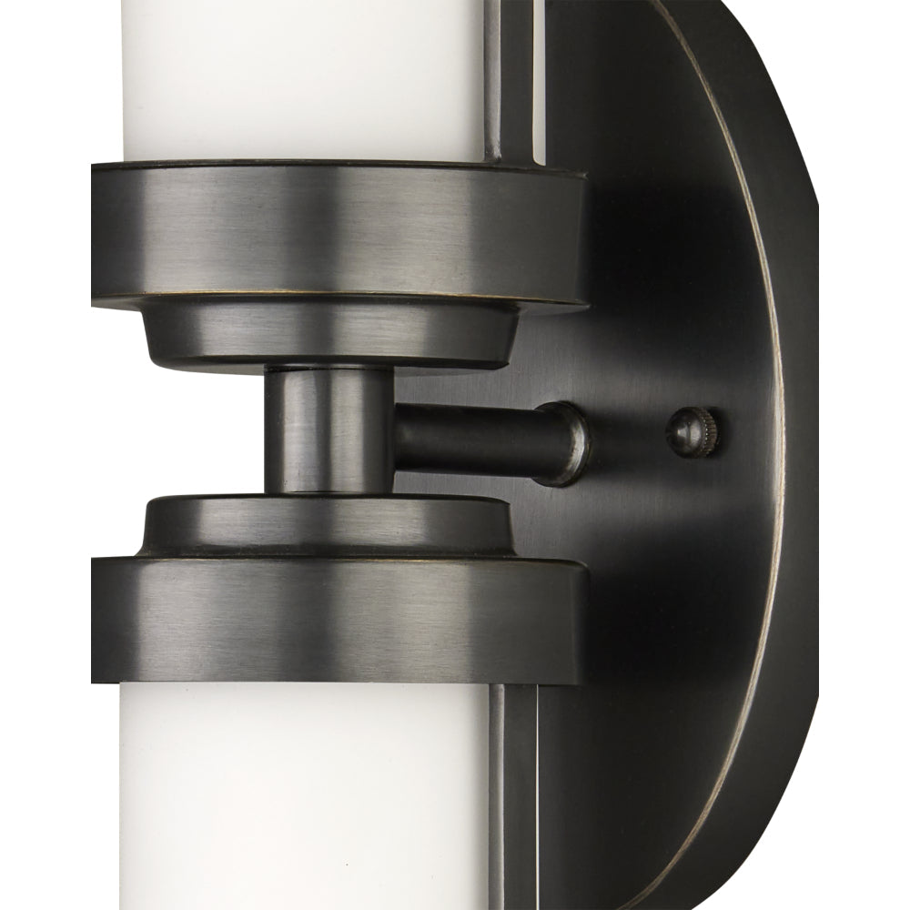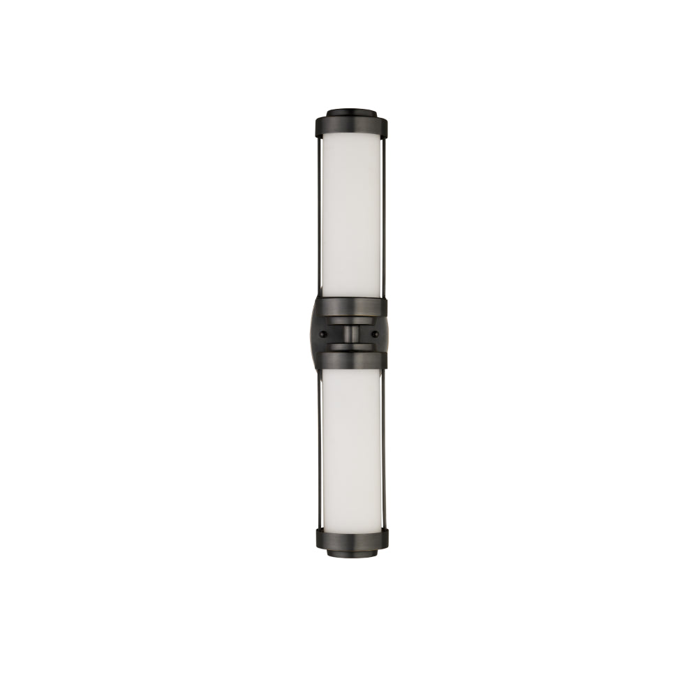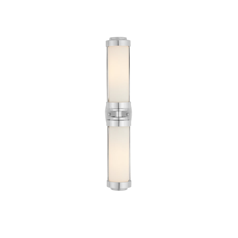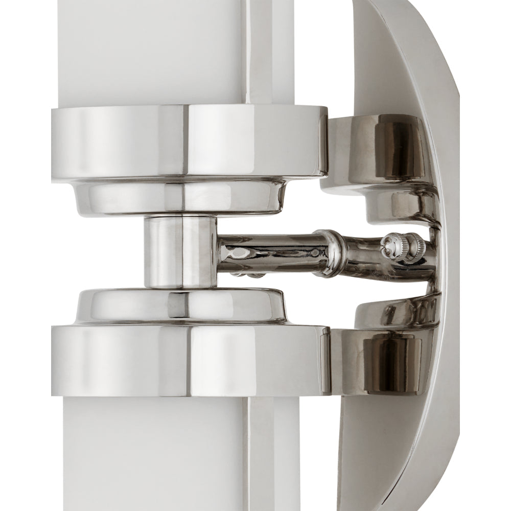 The Bowland Nickel Bath Wall Sconce features a contemporized hourglass shape designed with a fresh, modern feel. Inspired by an antique fixture, the time-honored profile is updated with sleek caps surrounding the opaque glass tubes at the top and bottom. The articulate center transition between the two elements further enhances this modernization. The metal on this fixture is in a polished nickel finish.