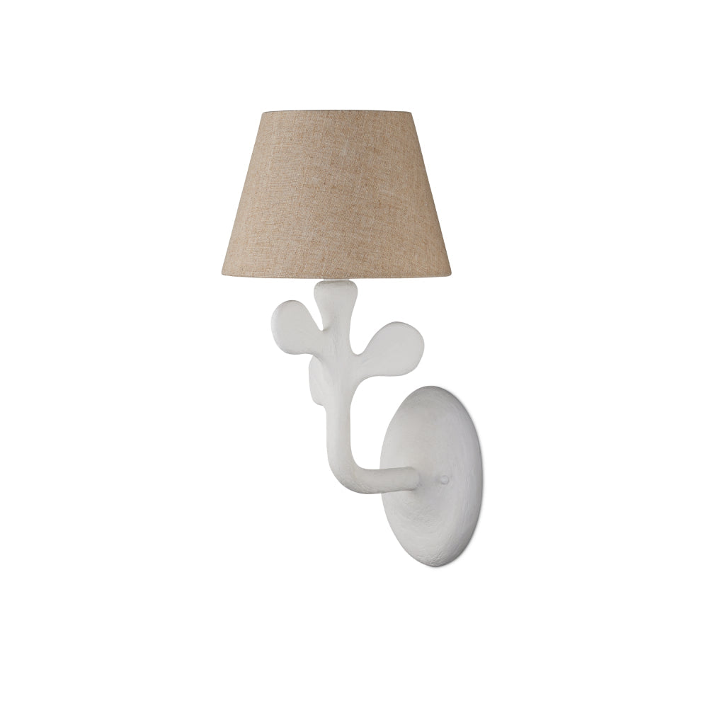 The playful profile of the Charny Wall Sconce makes this a charming addition to a room. The contemporary white wall sconce is made of composite with a Gesso White finish. The leaf-like shapes that extend from the stem of the Charny make this a terrific luminary for a space inspired by nature. The white sconce is topped with a textural natural shade in a coarse linen.