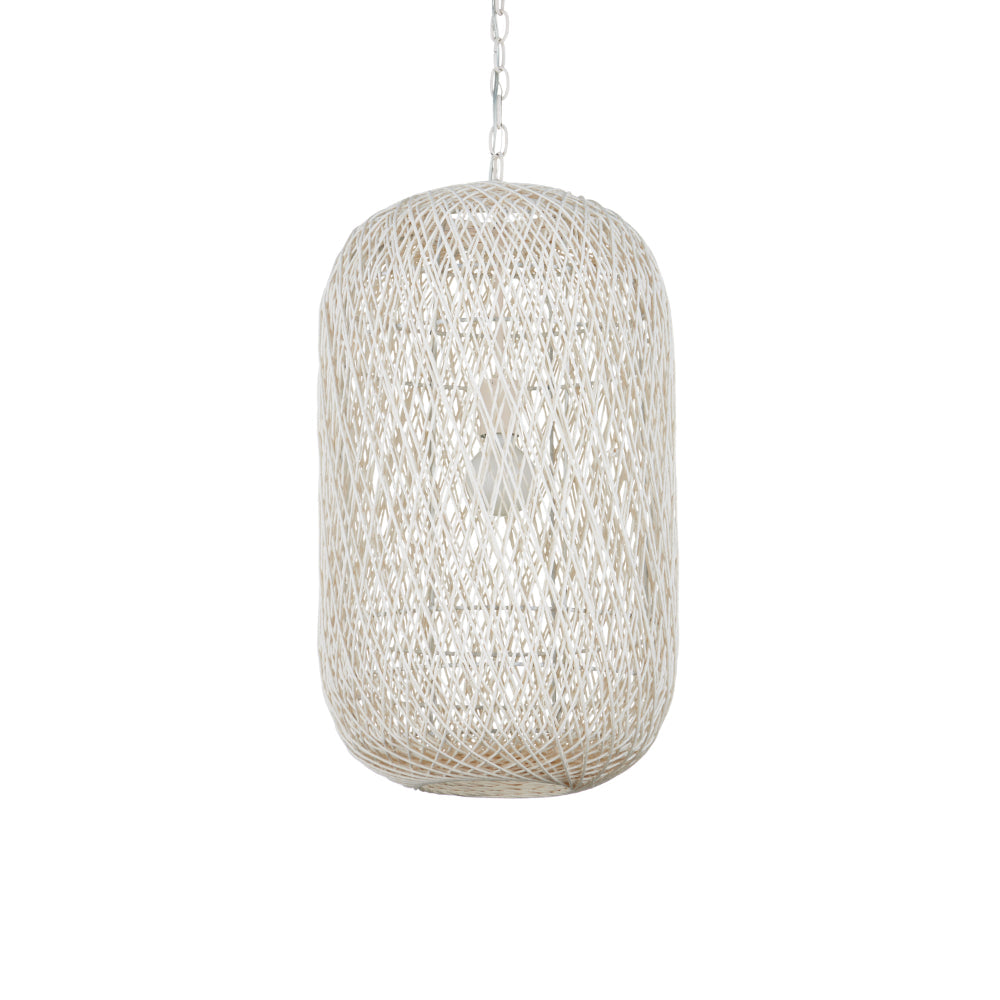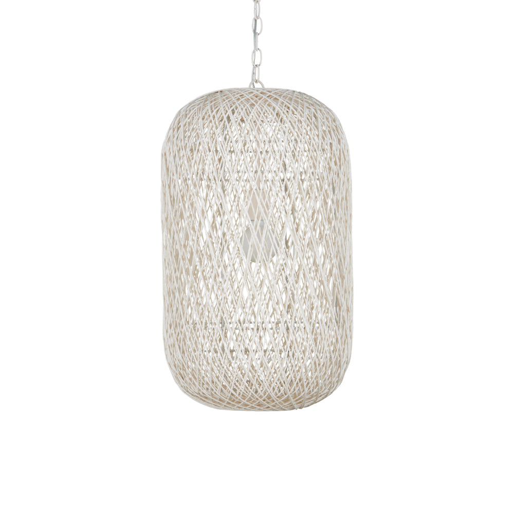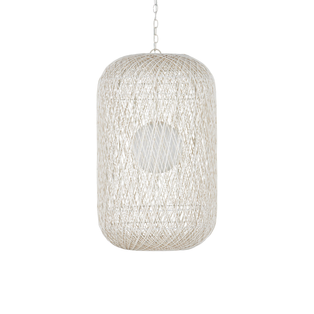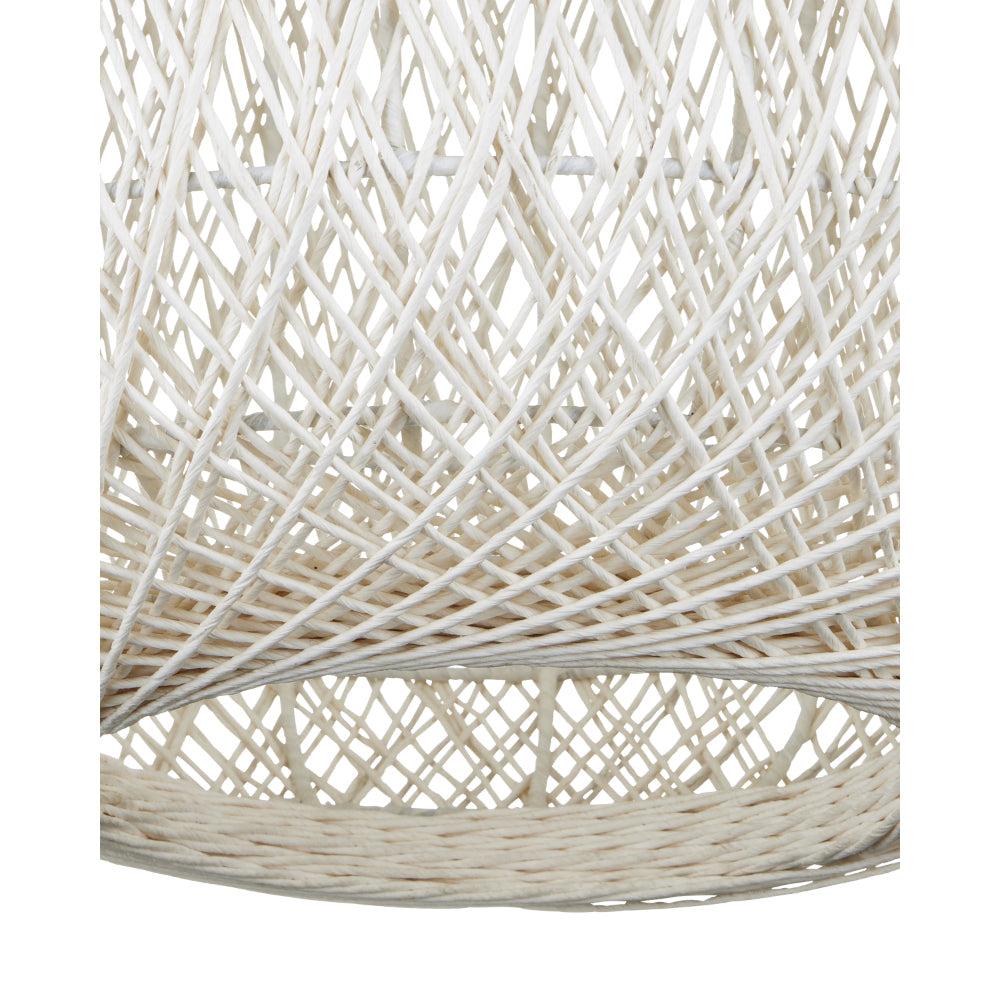 The Cocoon Large Pendant was inspired by a butterfly in chrysalis but it is meant for grander-scaled duties as a light fixture. The white pendant has a wrought iron frame covered in a vanilla finish that is beautifully wrapped in Kraft paper twine in a cream finish. The skill and patience required to create such an even flow of string makes this an artisanal piece. This large version of the Cocoon has a white glass globe in its interior to evenly distribute the light. Adjustable from 43.5" to 114" with use of included chain/rod kit/cable. If your space calls for a longer drop, additional chain/rods/cable is available for purchase.