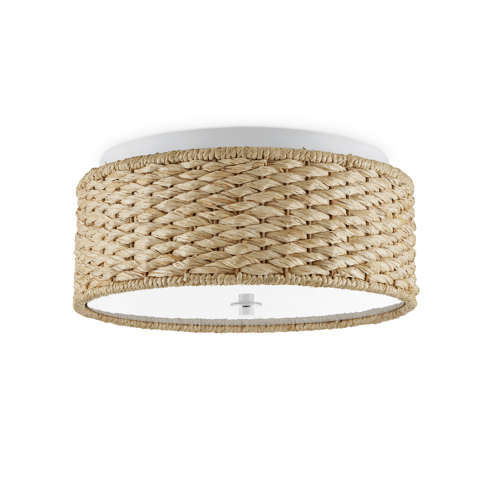 Raffia is densely woven around the circumference of the Colchester Flush Mount, creating a luminous design. Features that enhance the glow include the sugar white finish, the acrylic diffuser, the way the light flows onto the ceiling, and the weave that allows the light to seep through.