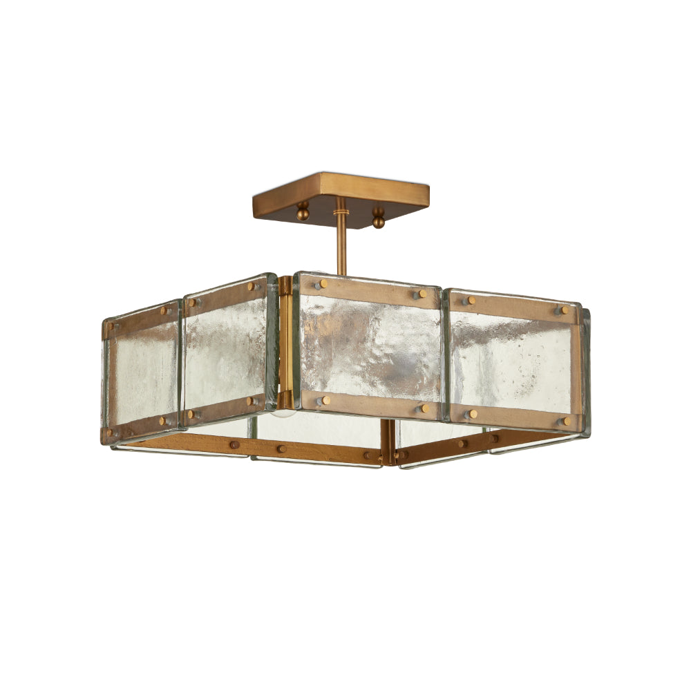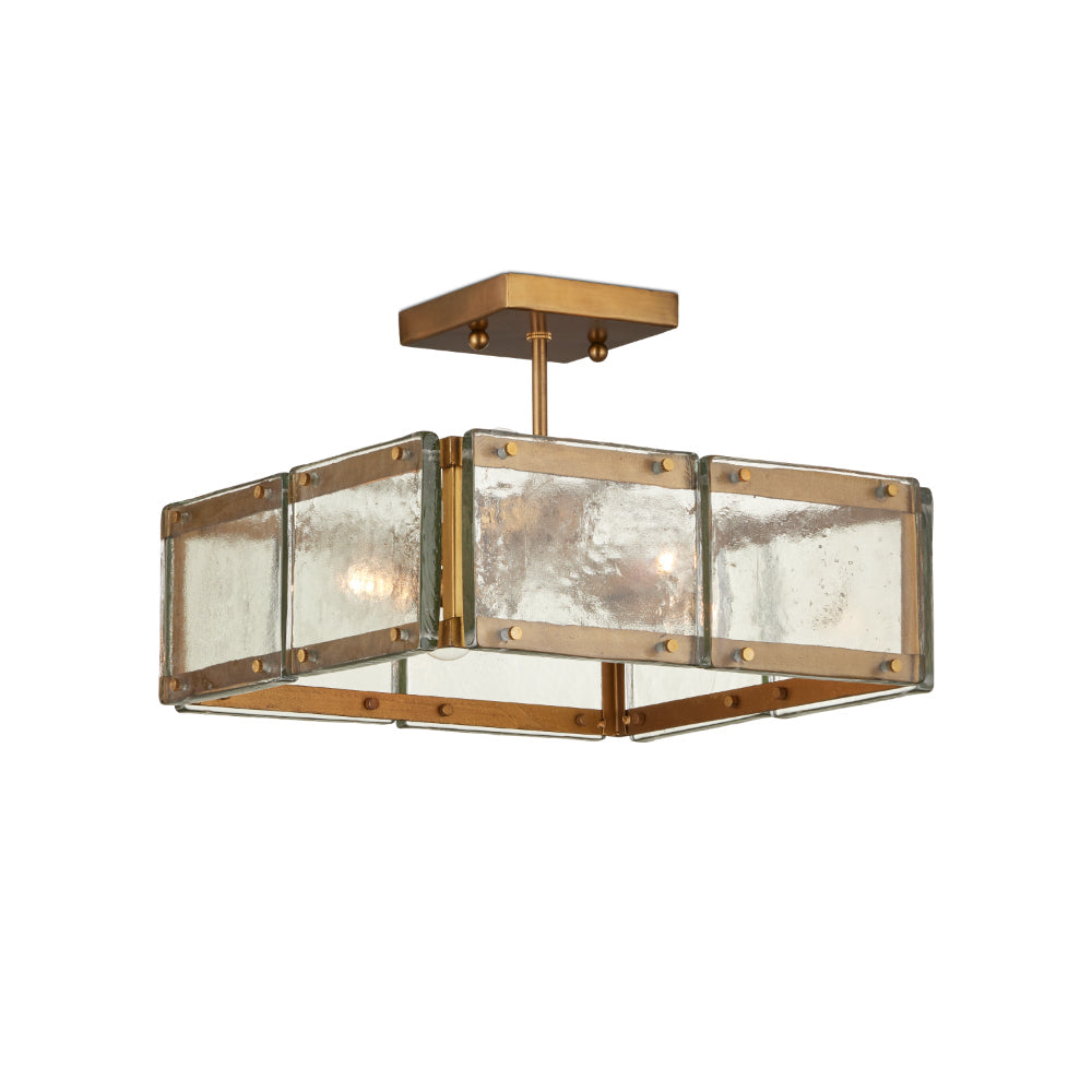 The Countervail Square Semi-Flush Mount was designed with its panes of thick cast glass. The textural surfaces were the starting point for this piece because the mottled nature of the glass would enhance the glow of the illumination from the clear and gold chandelier. Each unique piece of the material is fastened to a metal frame in an antique brass finish. The panes to be held in place with sophisticated screws, making a style statement and allowin each piece to be removable for cleaning.