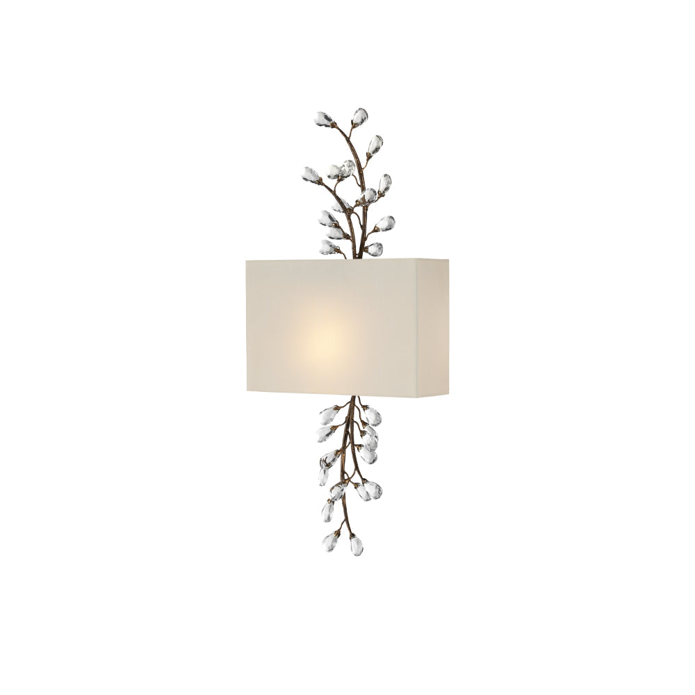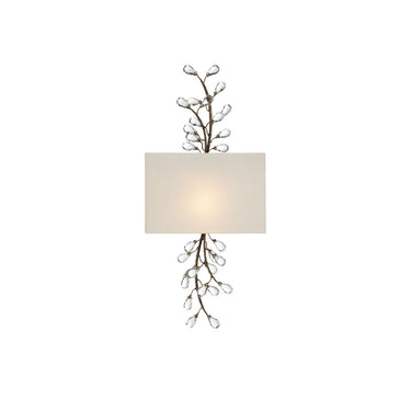 The Crystal Bud Tall Wall Sconce has delicate faceted crystals unfurling from vines that flow above and below its shade. The rust-colored metal in a Cupertino finish serves as a warm contrast to the luminous glass; the interplay making the profile of this crystal sconce complex and interesting. This is one of the fixtures in the varied Crystal Bud family of lights. The crystal sconce has a beautifully placed rectangular shade made of off-white shantung to make the fixture ADA compliant.