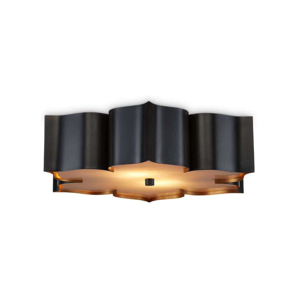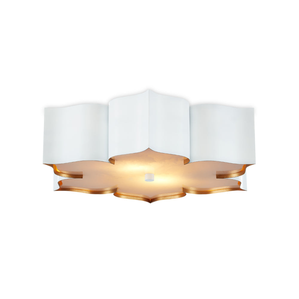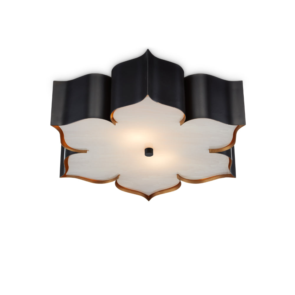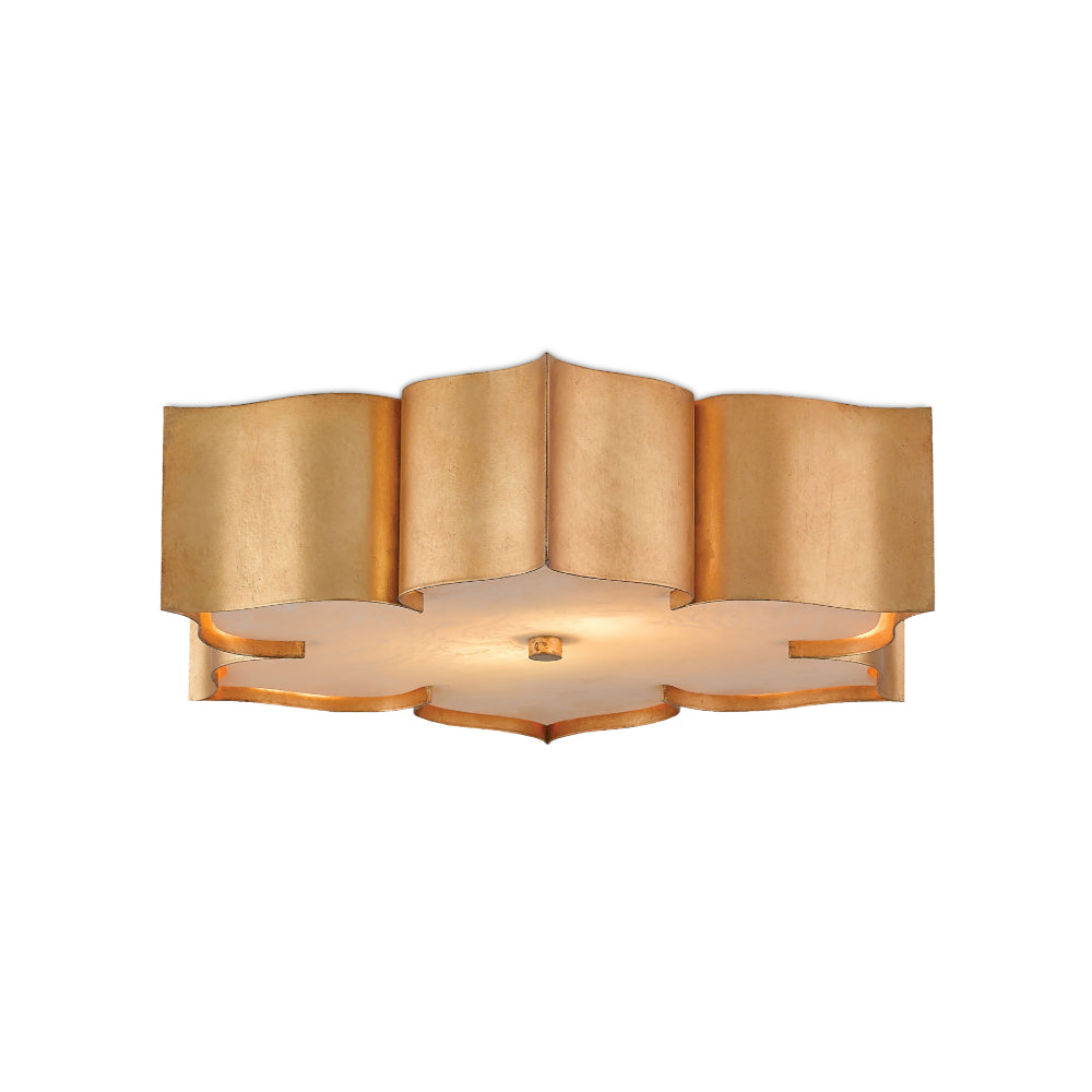 The Grand Lotus Gold Flush Mount receives its majestic good looks from a combination of stunning workmanship and its antique gold leaf finish. The gold flush mount is skillfully fashioned from sheets of wrought iron. This is one of a number of designs in a variety of finishes in this family of fixtures.