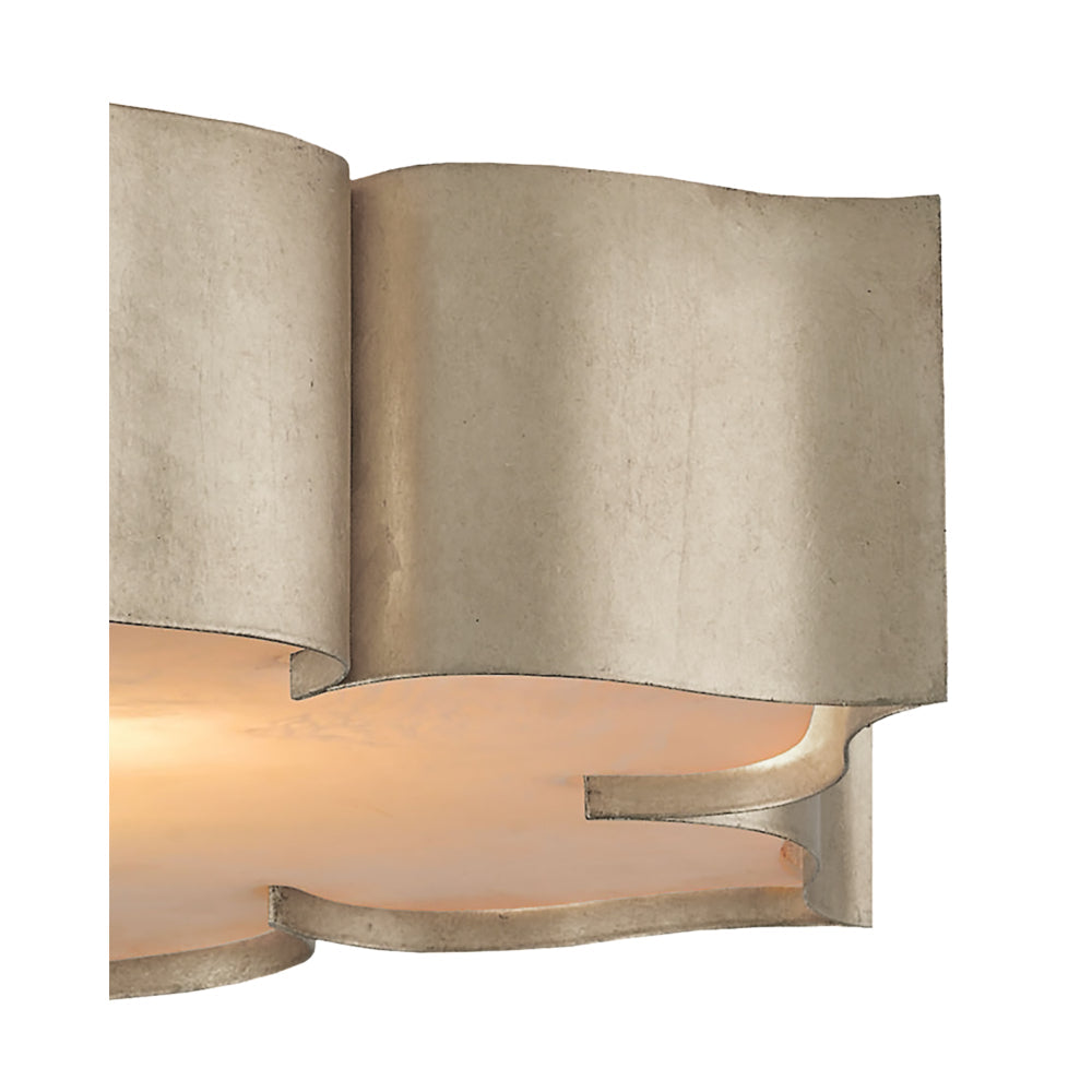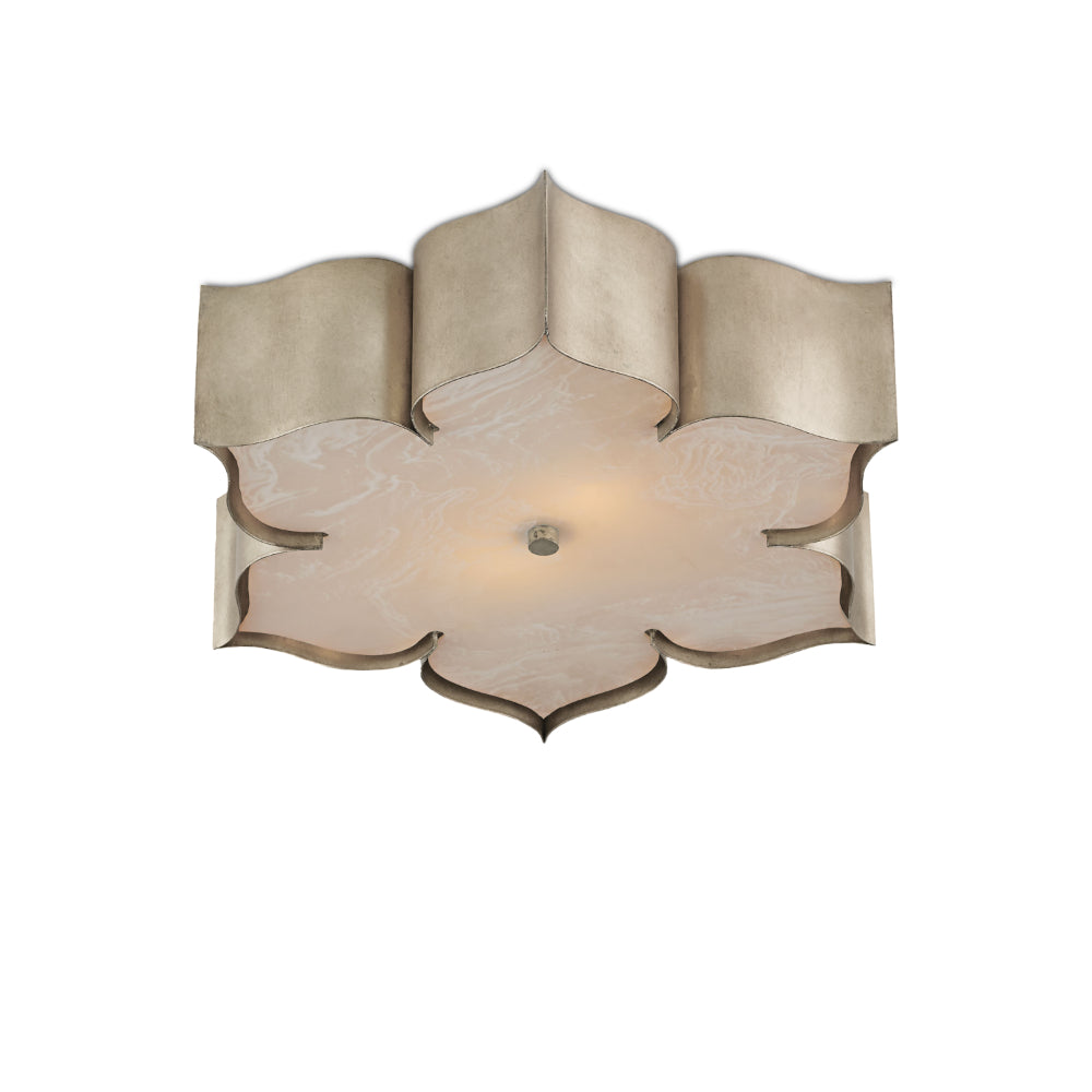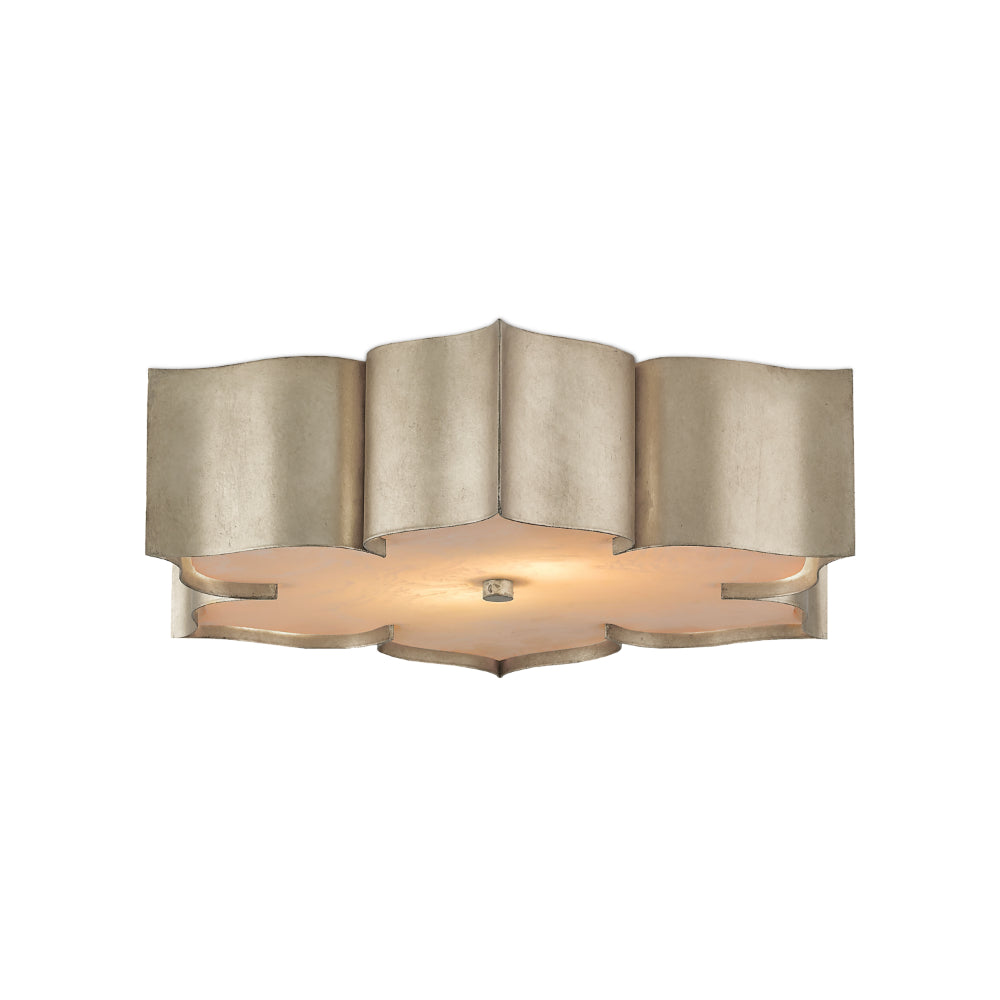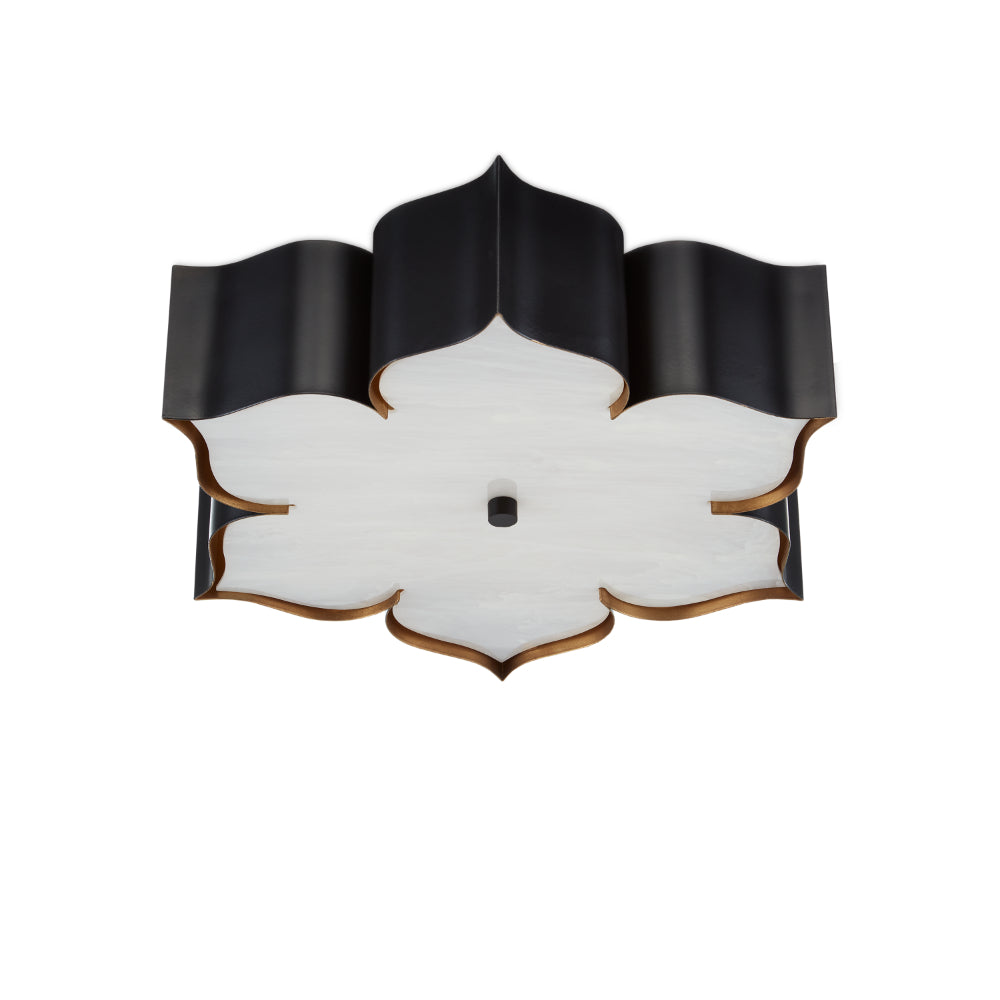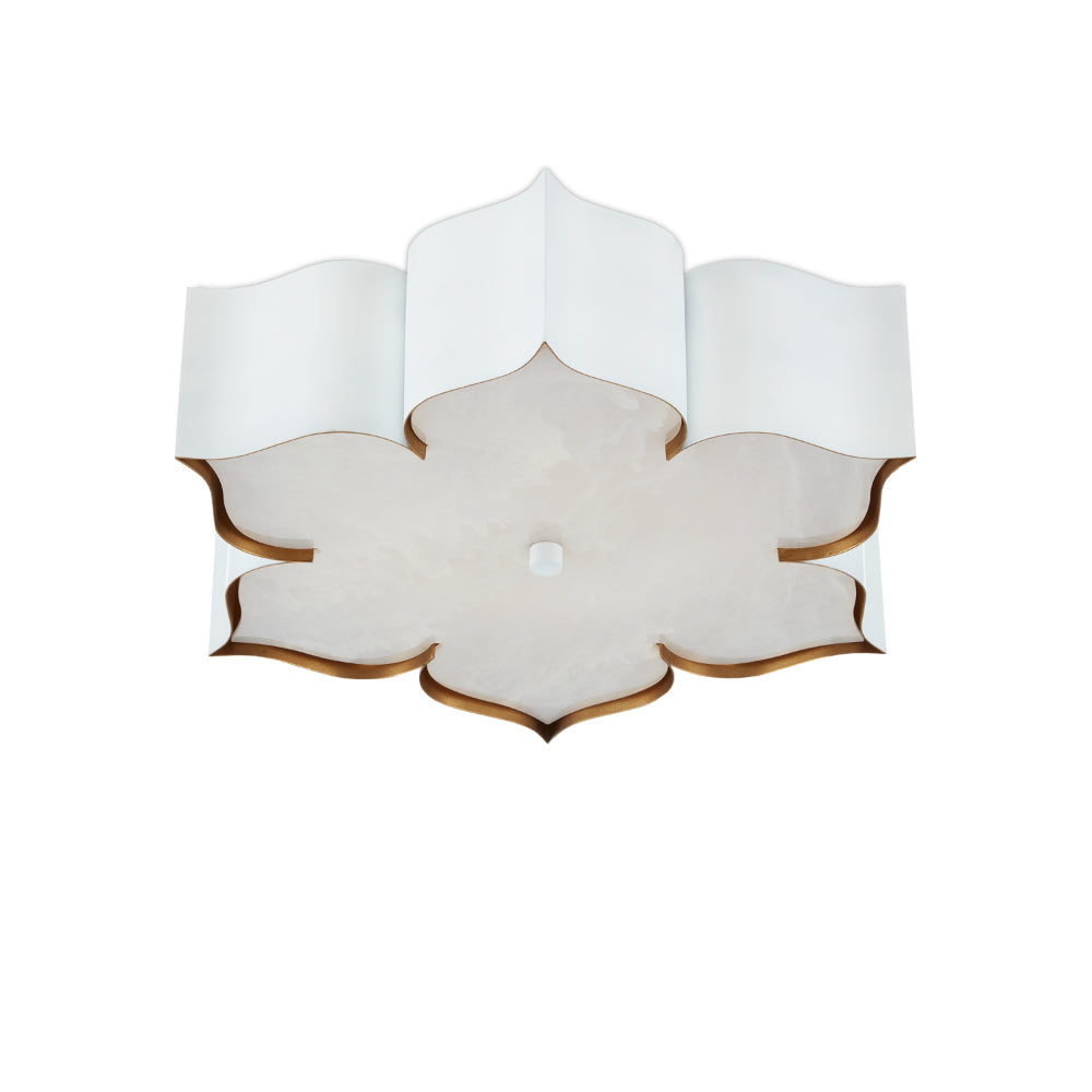 The Grand Lotus Gold Flush Mount receives its majestic good looks from a combination of stunning workmanship and its antique gold leaf finish. The gold flush mount is skillfully fashioned from sheets of wrought iron. This is one of a number of designs in a variety of finishes in this family of fixtures.