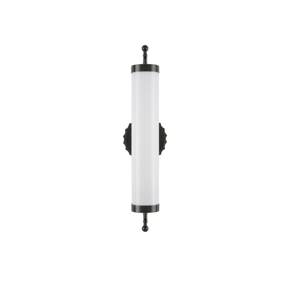 The Latimer Bronze Wall Sconce in the Barry Goralnick Collection is made of metal in an oil-rubbed bronze finish and a tubular milk-glass shade. This black sconce is certified for damp locations and can be installed horizontally or vertically. This thoughtful aspect of the design is not a surprise given Goralnick is an architect and his creations tend to be engineered at the highest levels of specificity.