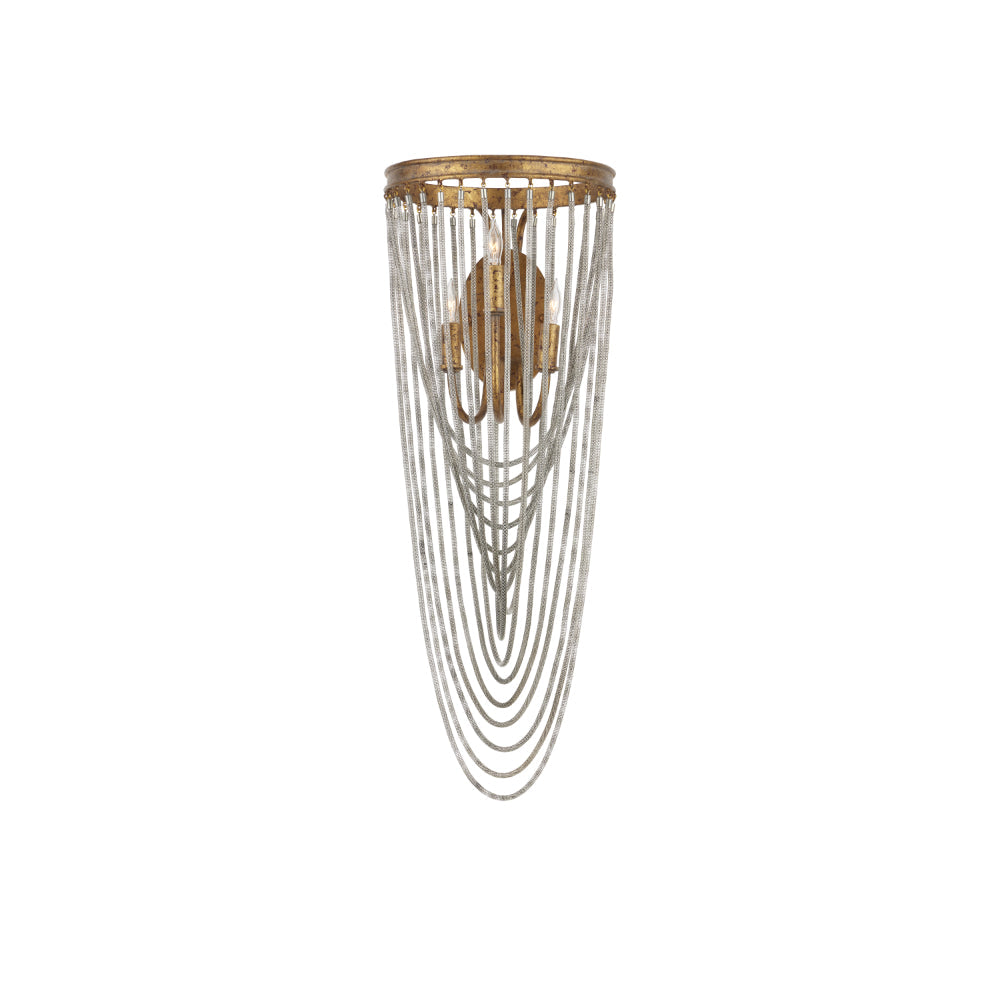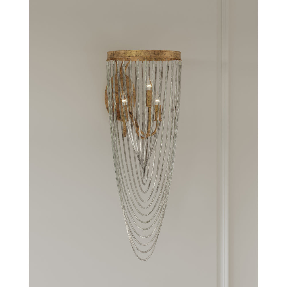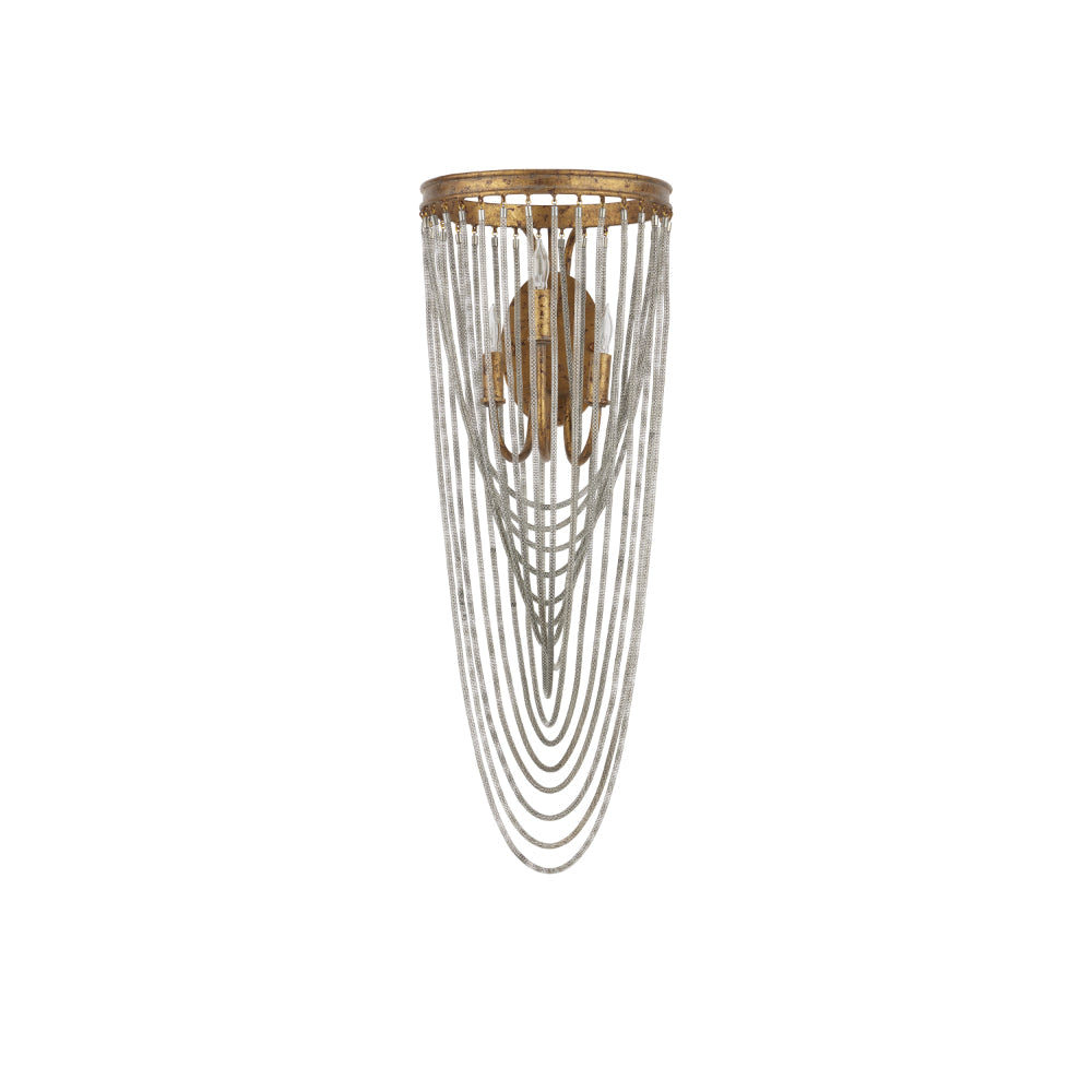 The dainty chains looping from point to point on the circular ring of the Lucien Wall Sconce are draped methodically and intentionally in a crisscross pattern. These bring this gold wrought iron sconce a sense of old world style, which is furthered by the French gold leaf finish on the metal. This gold sconce will grace a space like a piece of jewelry.
