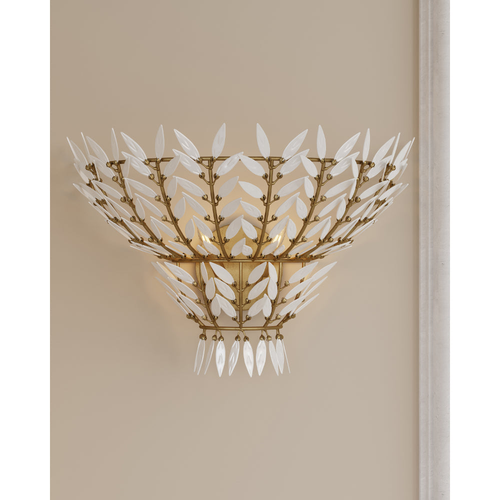 Undertaking the challenge of creating a clean-lined version of a vintage design, the Magnum Opus Wall Sconce features rows of glass leaves attached to metal stems that arc around the wall-plate. The glass leaves effervesce when light strikes them, creating a stunning sculptural fixture. The white glass beautifully contrasts the metal in a brass finish, bringing a heightened level of texture to the gold sconce while infusing a space with a lovely glow.